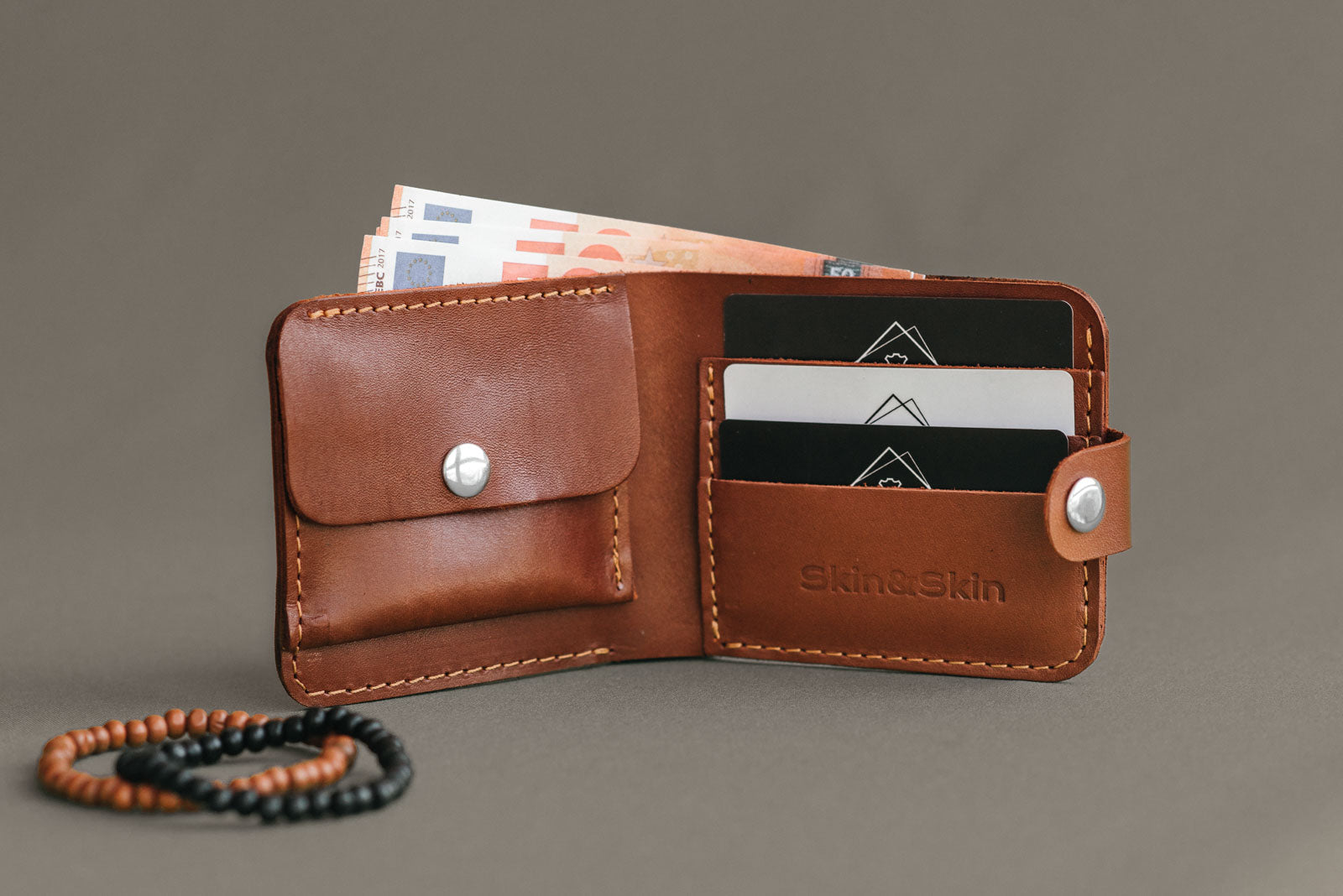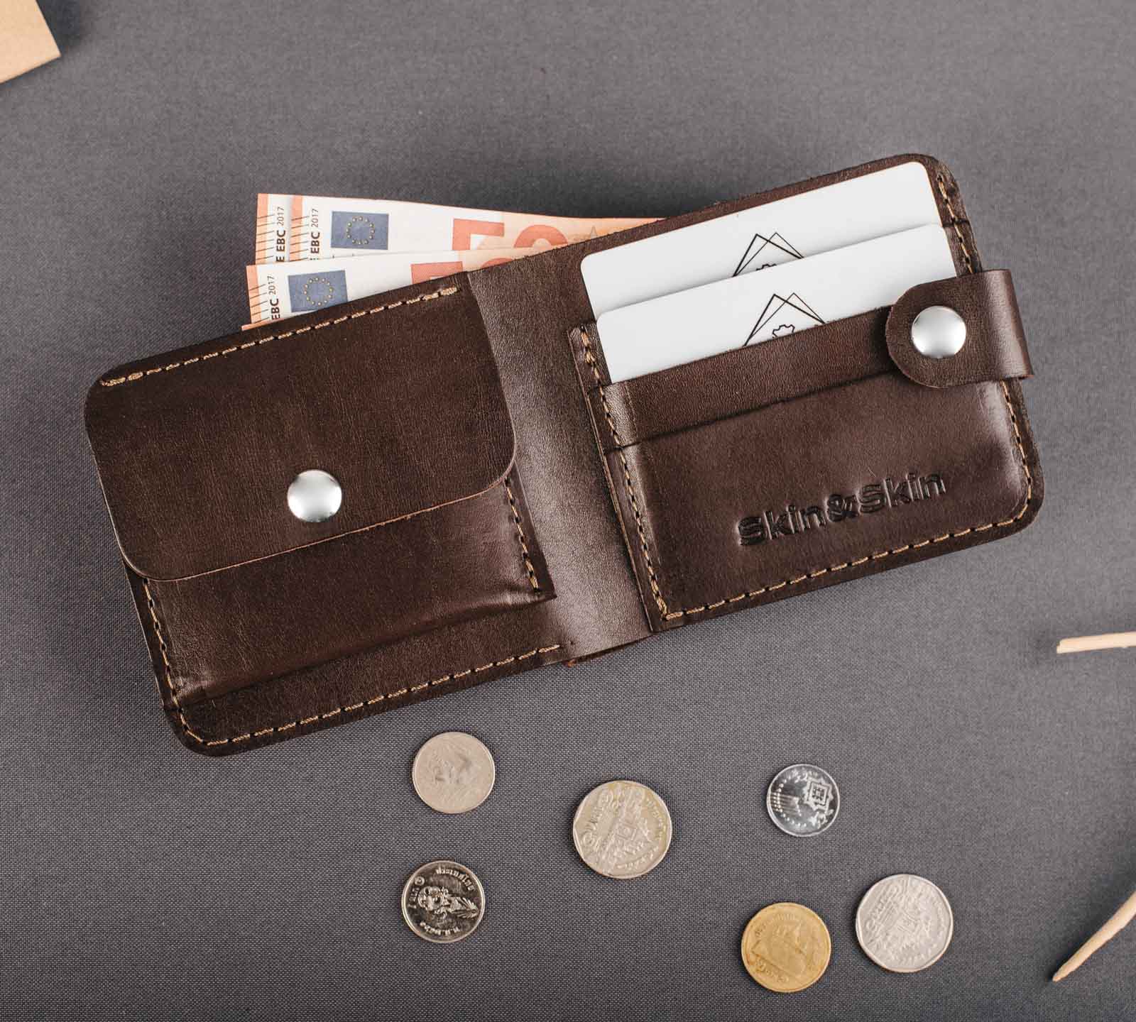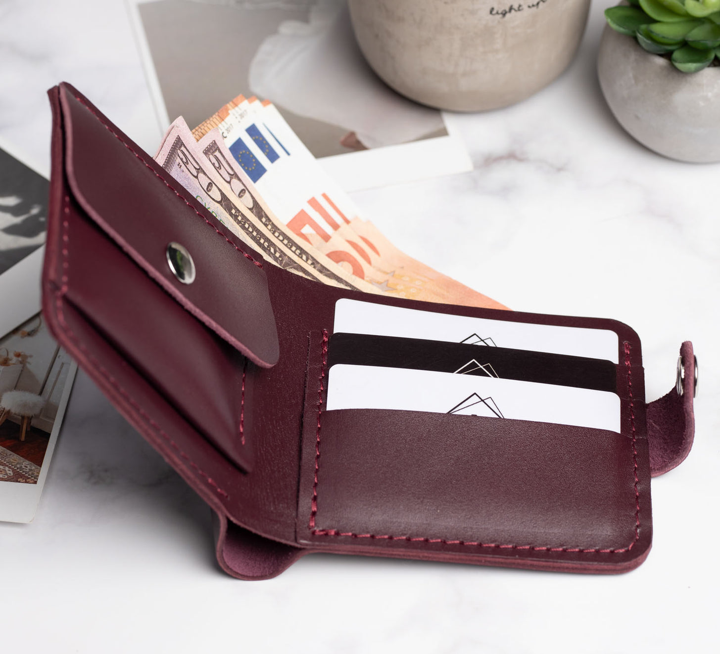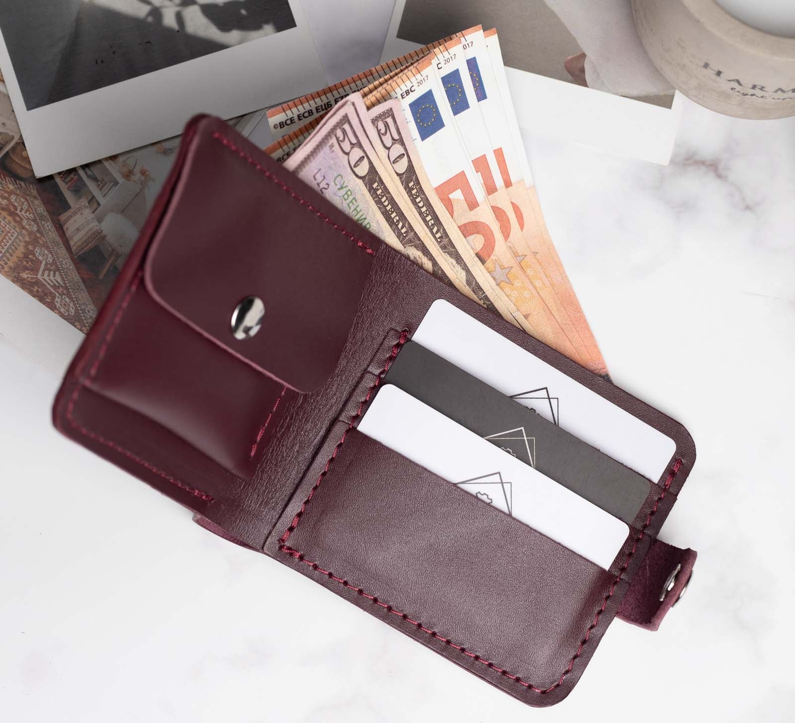 1. Біфолд має 1 відділ для купюр і 3 слоти під картки. У ньому є кишеня для монет і дрібничок.