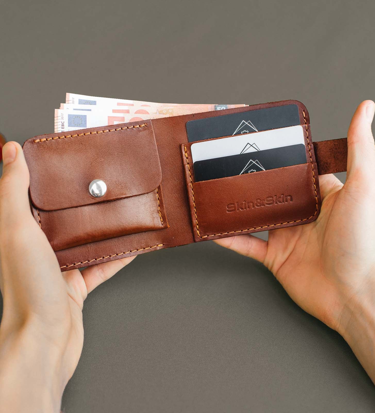 2. Гаманець виготовлений з натуральної шкіри. Він має декілька варіацій. Перша варіація моделі – монетниця + 3 слоти під карти. Друга варіація – монетниця + 6 слотів під карти.