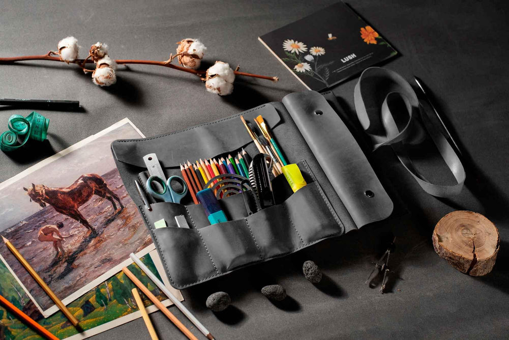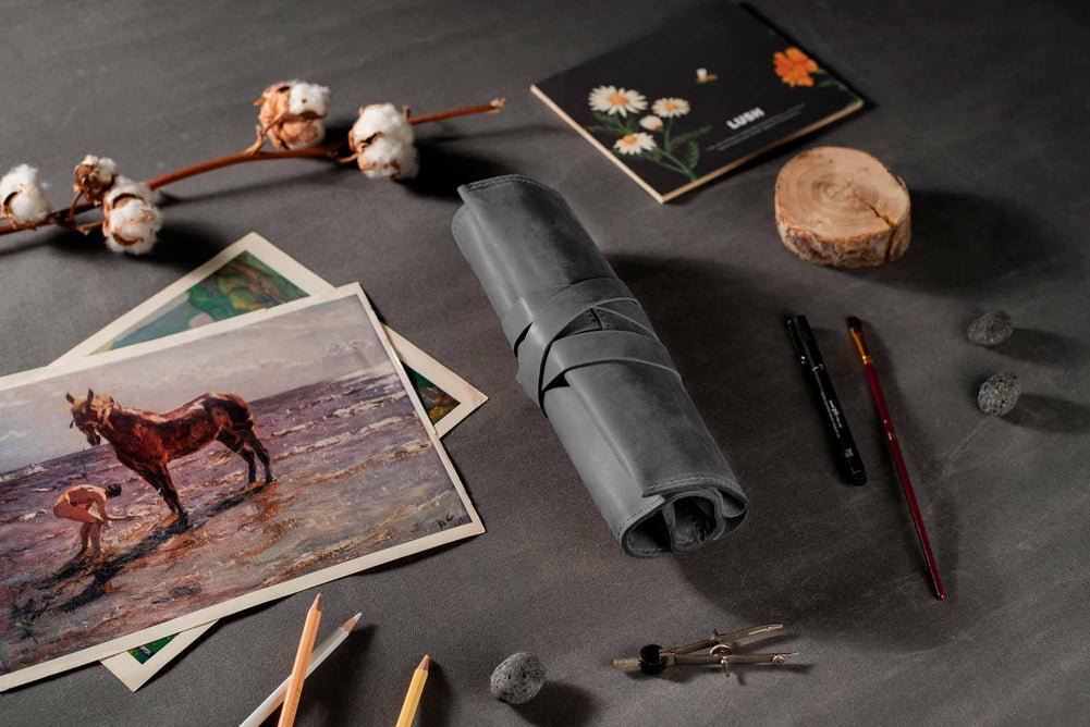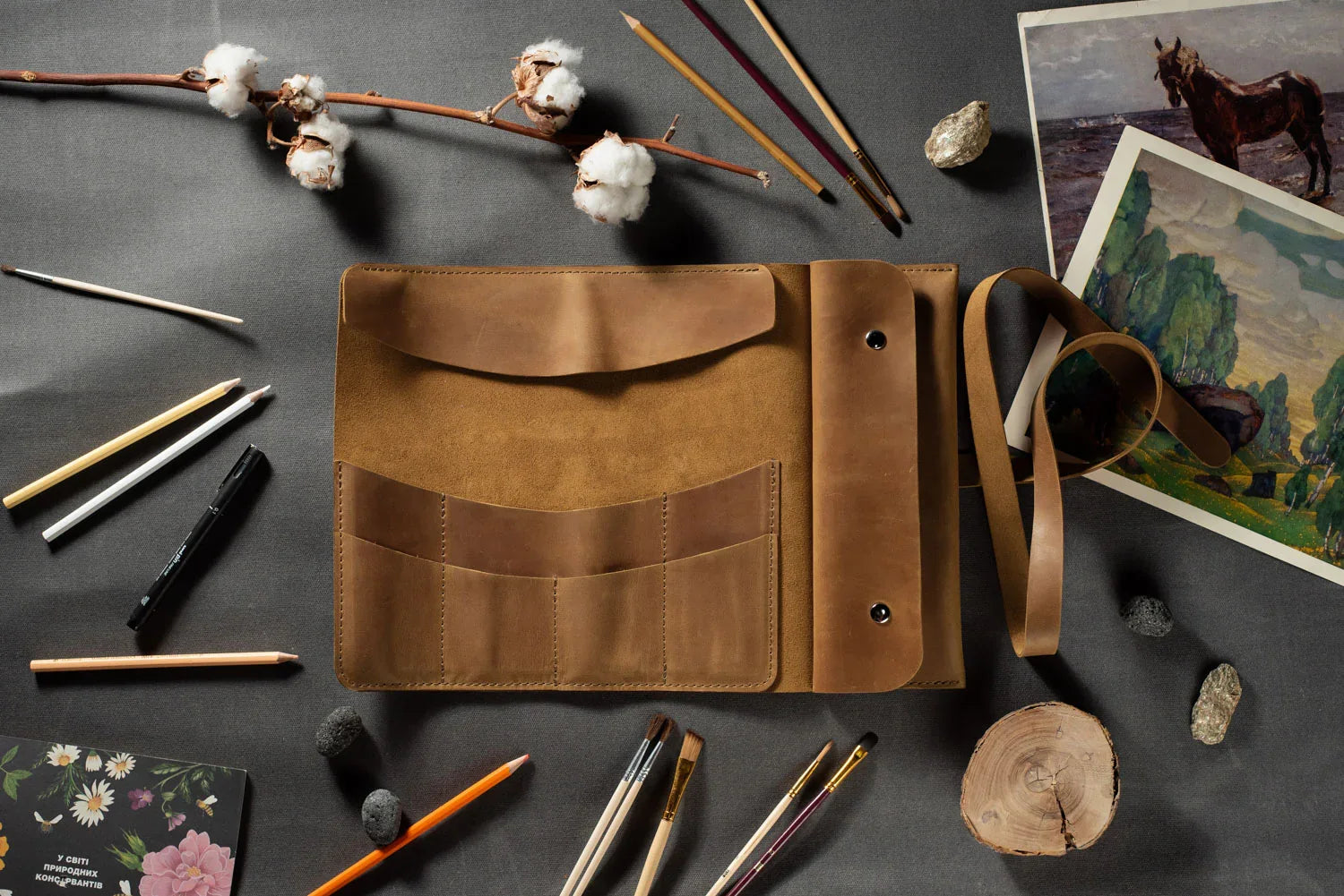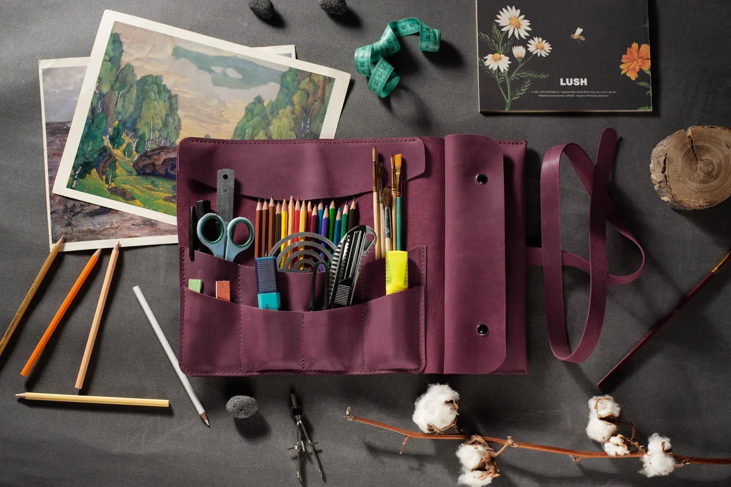 Виготовлений вручну з гладкої натуральної шкіри, що має полірувану поверхню та приємну на дотик фактуру. Усередині – продумане розташування кишень різної ширини для різних типів інструментів: від тонких маркерів до пензлів або косметичних аксесуарів.