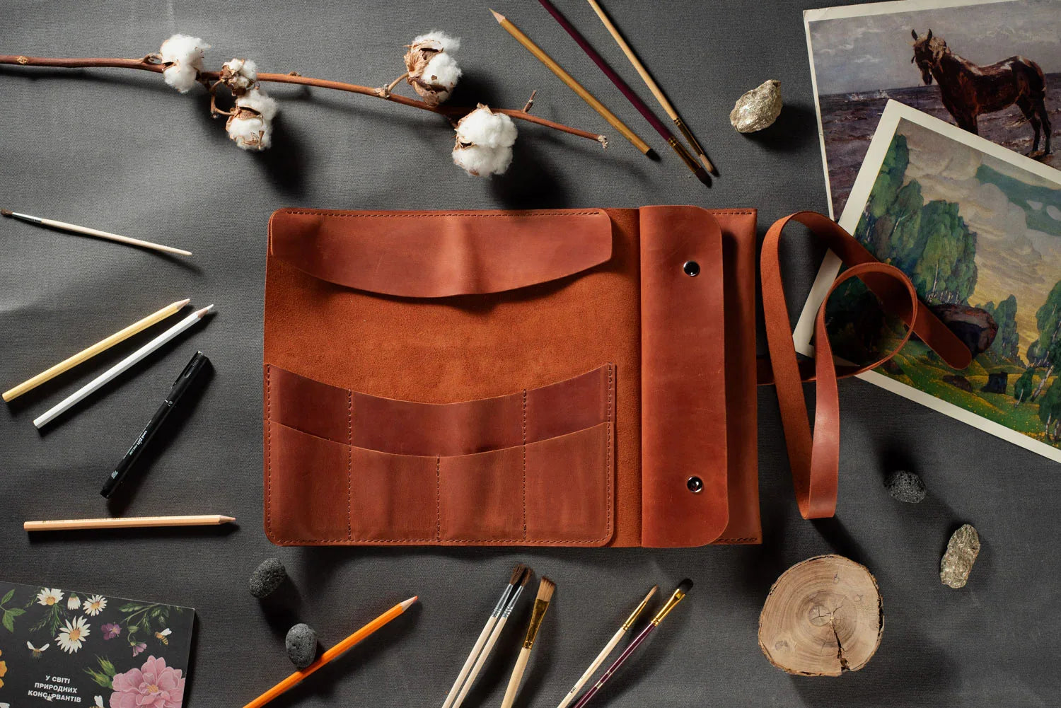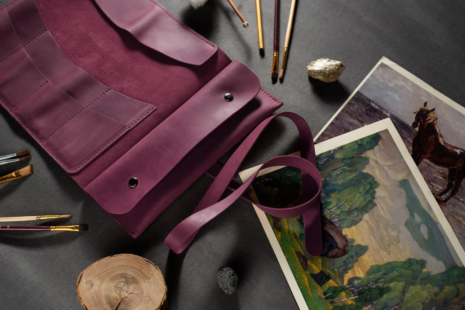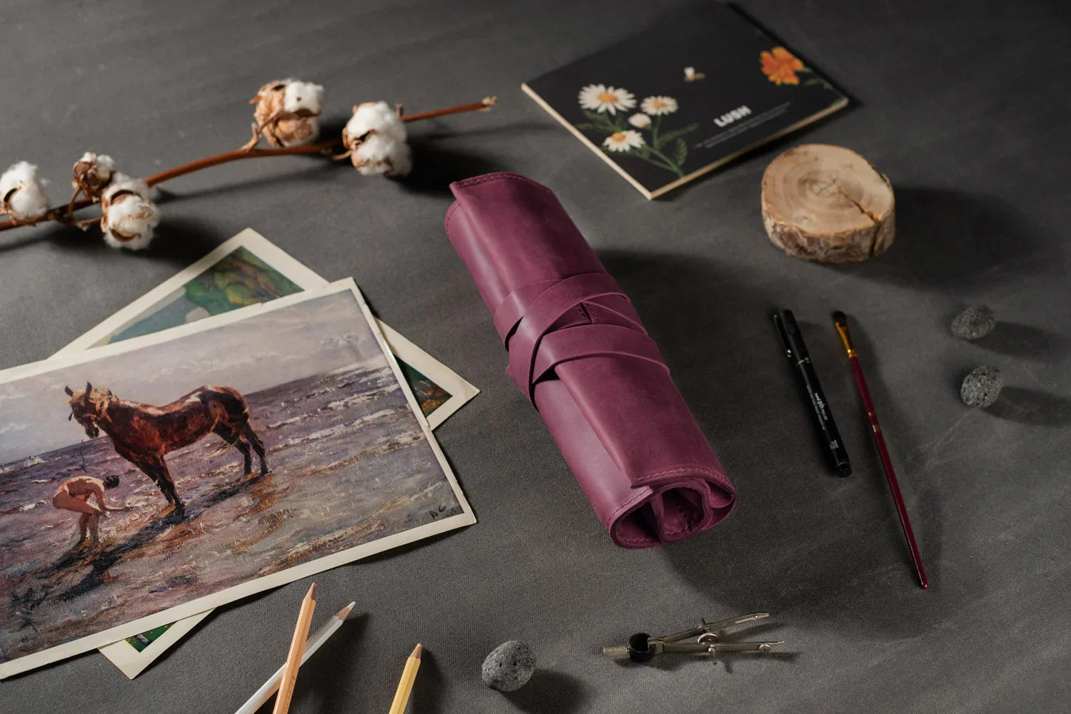 Виготовлений вручну з гладкої натуральної шкіри, що має полірувану поверхню та приємну на дотик фактуру. Усередині – продумане розташування кишень різної ширини для різних типів інструментів: від тонких маркерів до пензлів або косметичних аксесуарів.