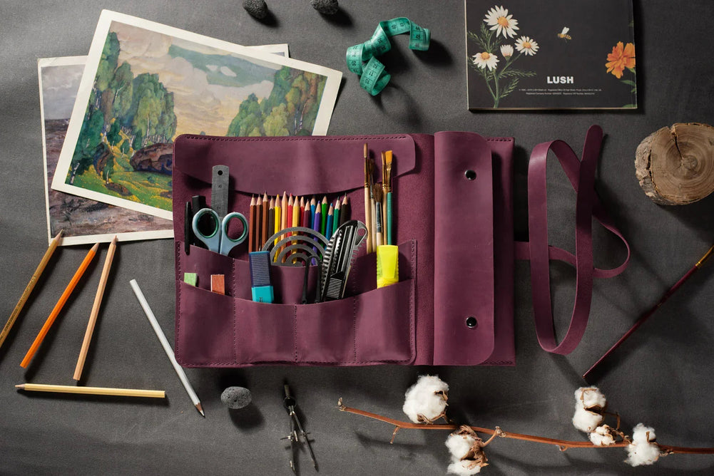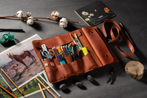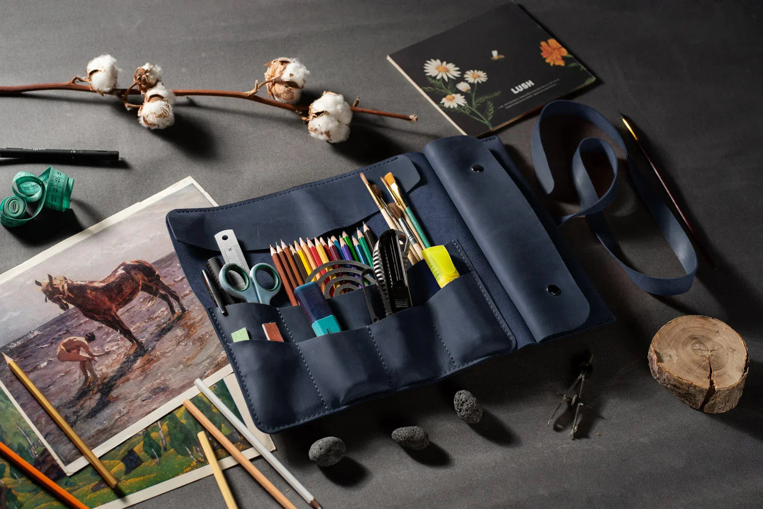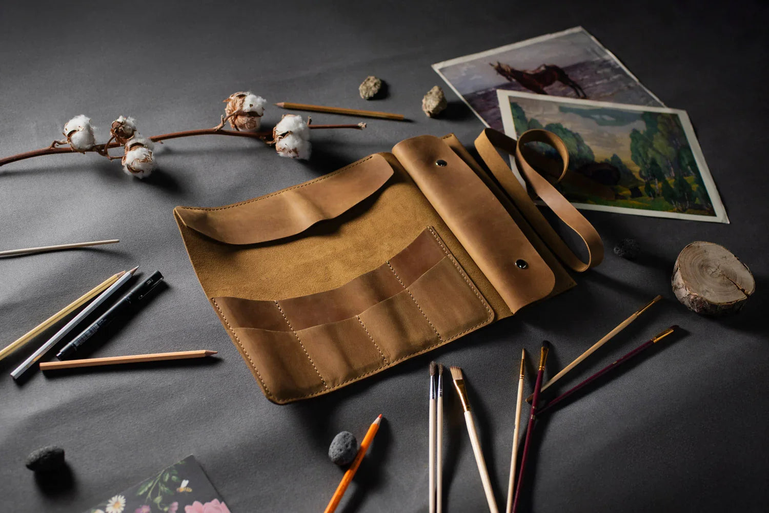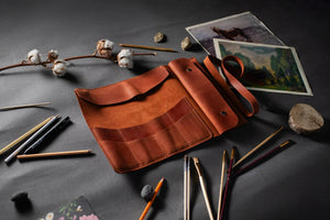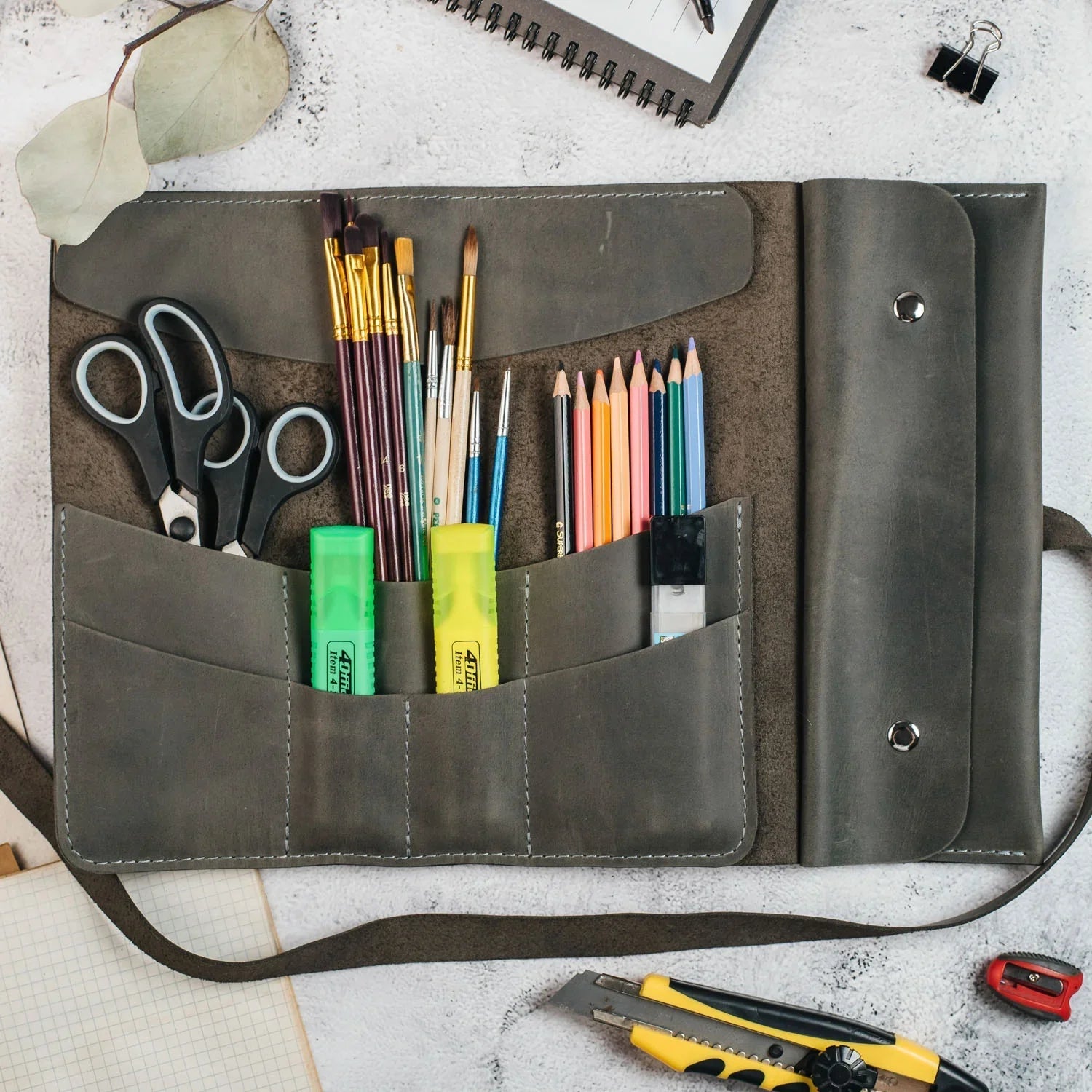 Практичний шкіряний органайзер створений для майстрів, художників, студентів і фахівців, яким потрібне компактне рішення для зберігання робочих інструментів. У ньому зручно тримати пензлі, ручки, ножі, косметичні пензлі чи креслярські приладдя – все під рукою й у безпеці.