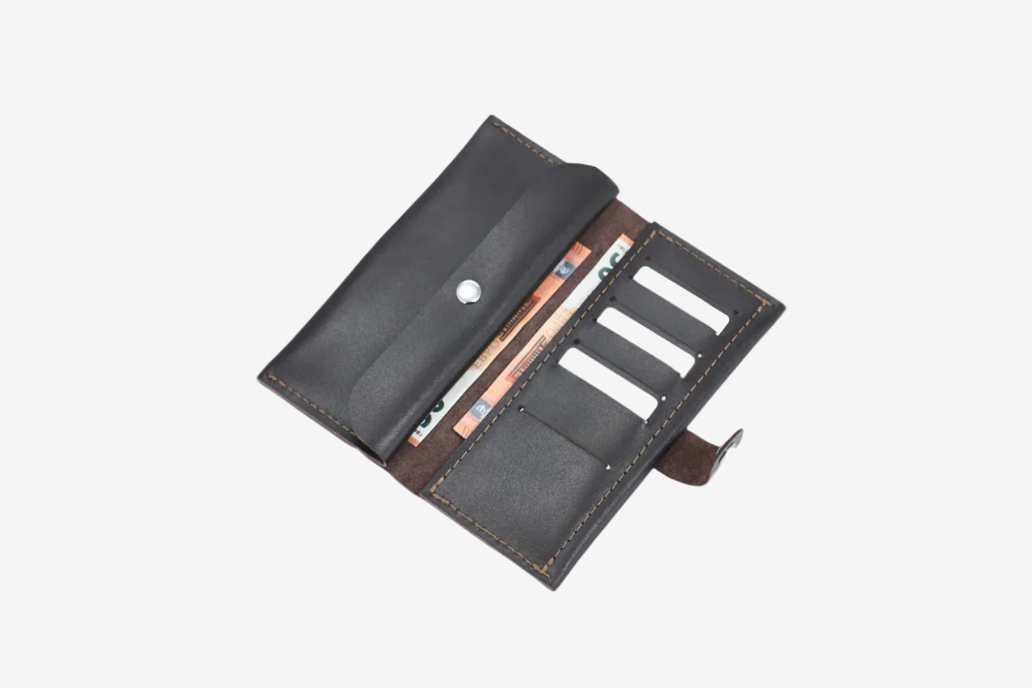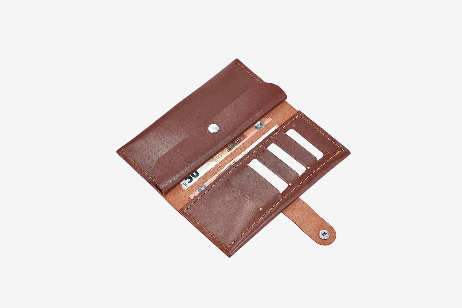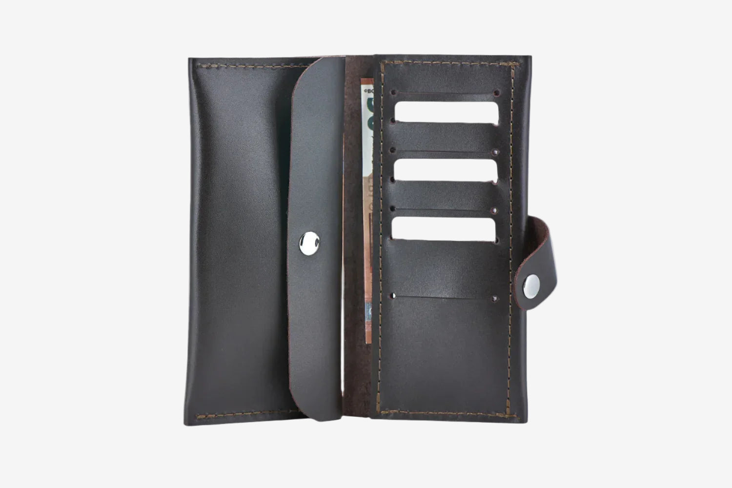 Портмоне має 2 відділи під купюри. Застібається на металеву кнопку, розташовану зовні. Кнопка робить виріб більш оригінальним і стильним. Портмоне вміщує купюри будь-якого розміру. У нього також з легкістю можна помістити смартфон.