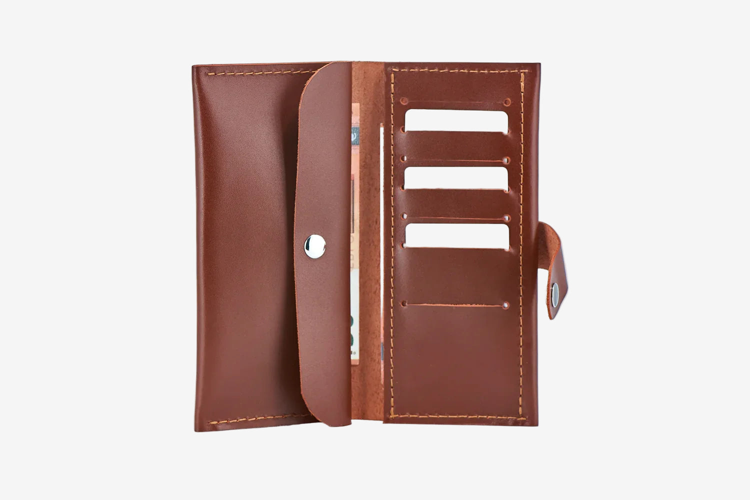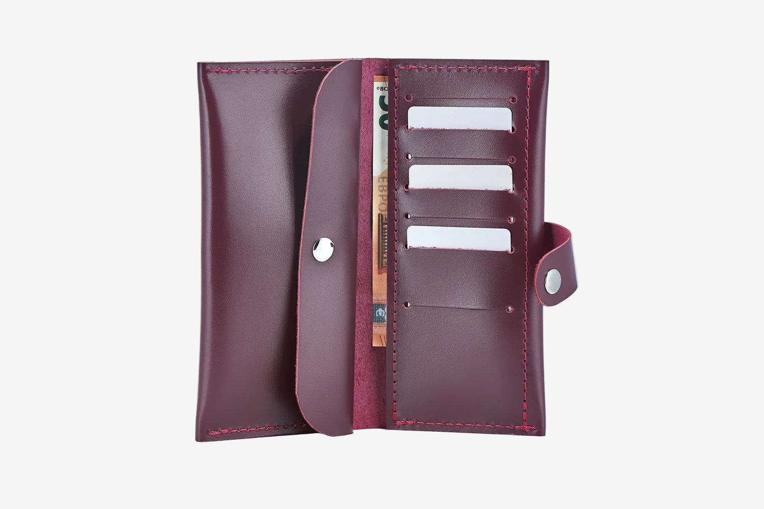 Портмоне має 2 відділи під купюри. Застібається на металеву кнопку, розташовану зовні. Кнопка робить виріб більш оригінальним і стильним. Портмоне вміщує купюри будь-якого розміру. У нього також з легкістю можна помістити смартфон.