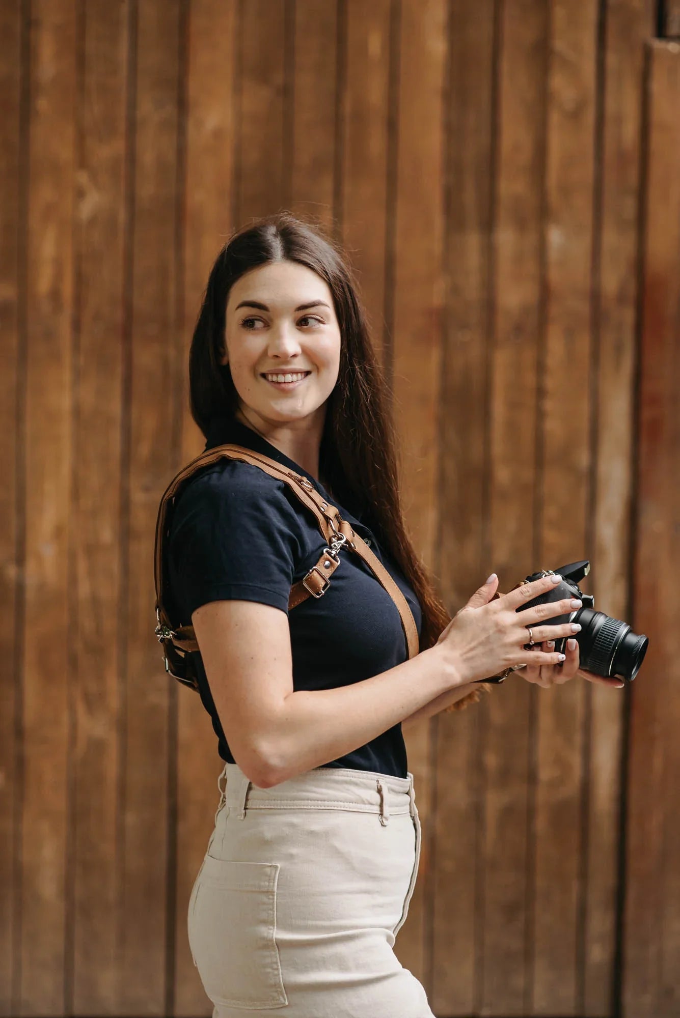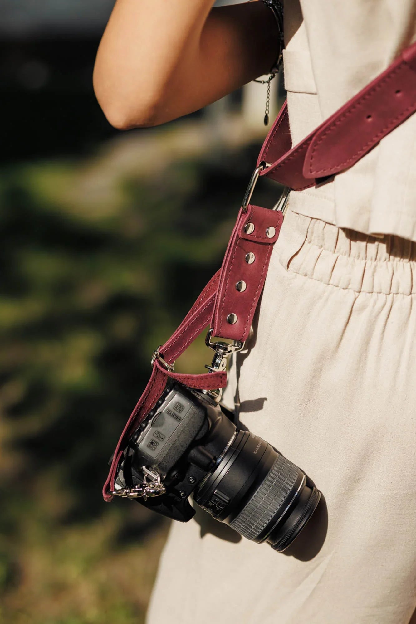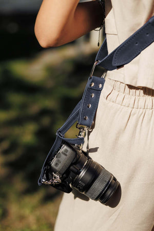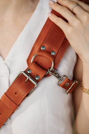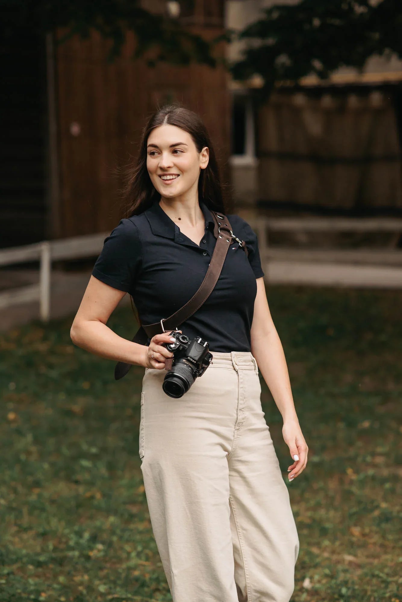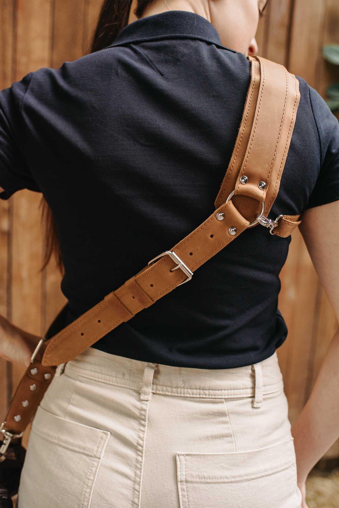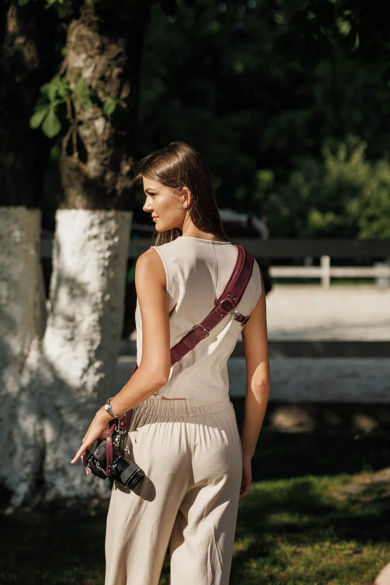 Одноремінна шкіряна портупея створена для фотографів, які цінують свободу руху й міцність матеріалів. Виготовлена з матової воскової шкіри, вона забезпечує надійну фіксацію камери без компромісів щодо комфорту.