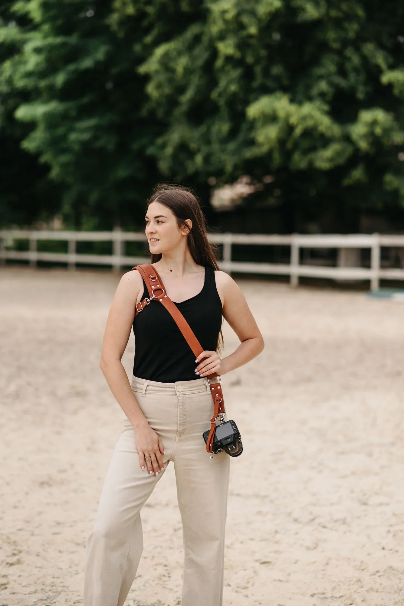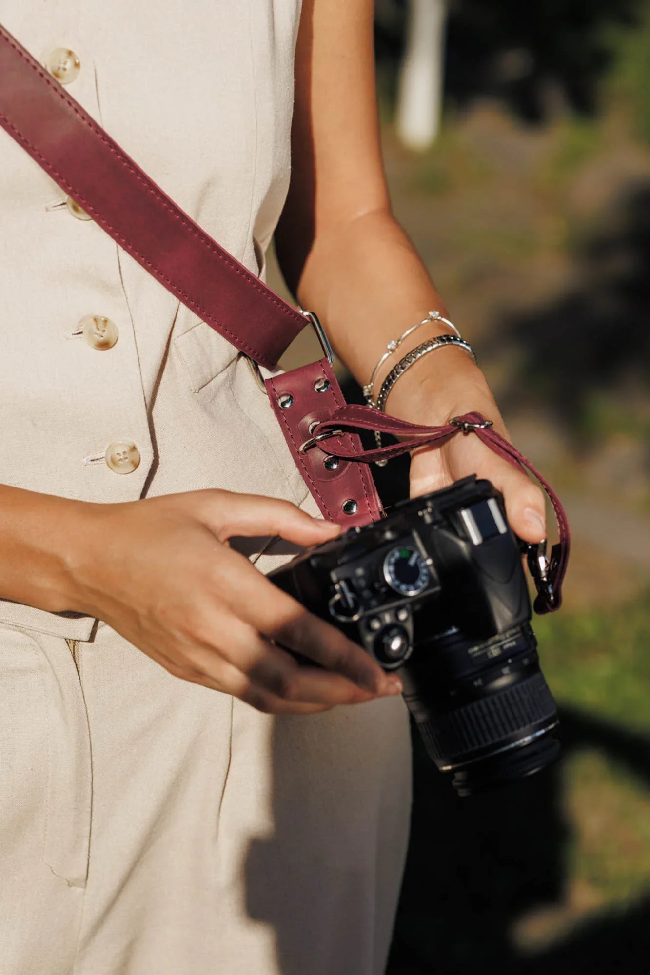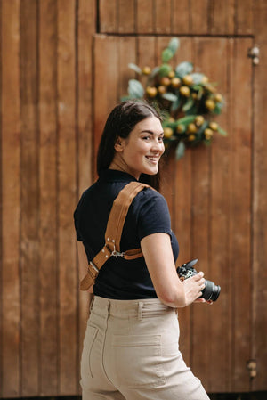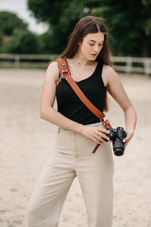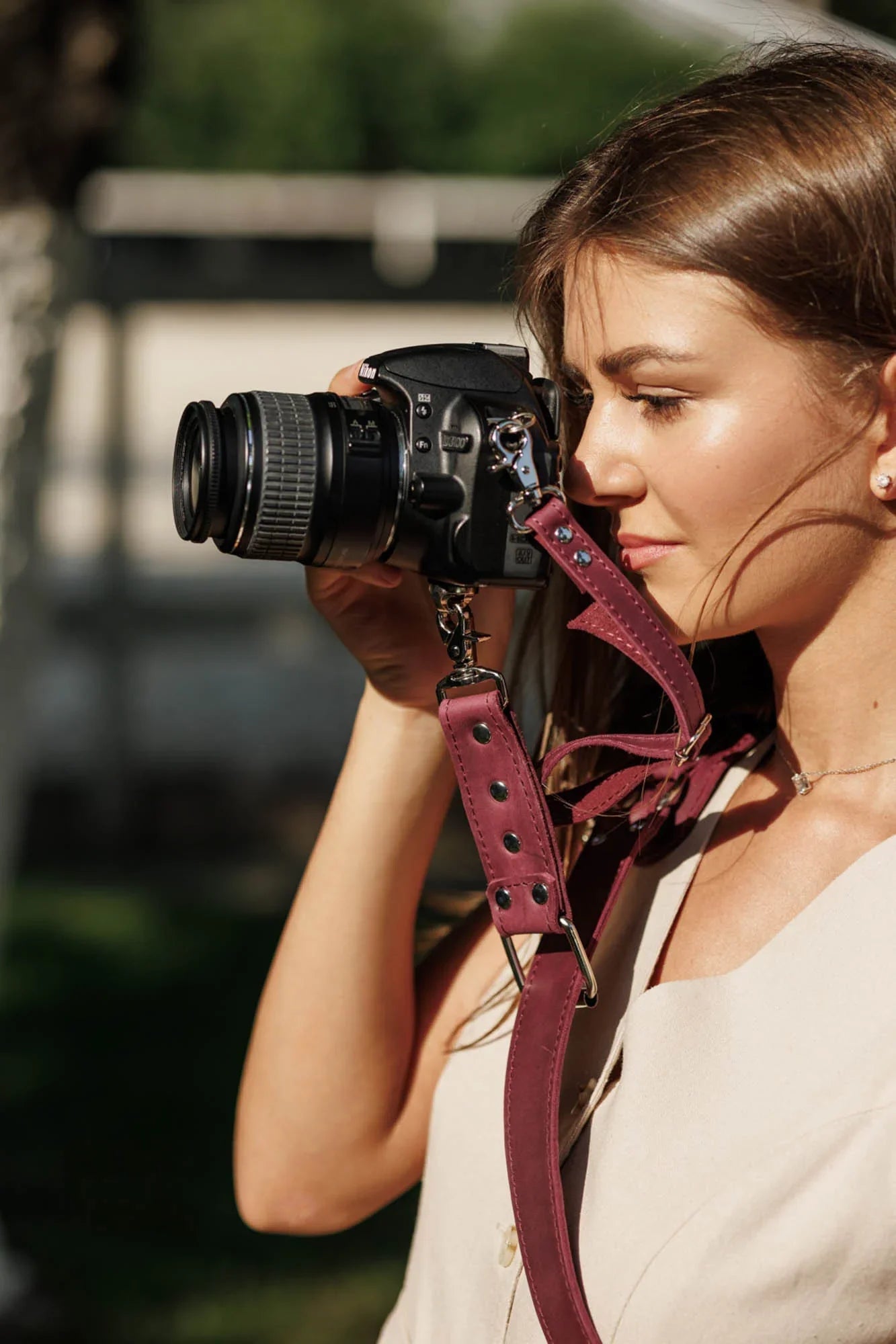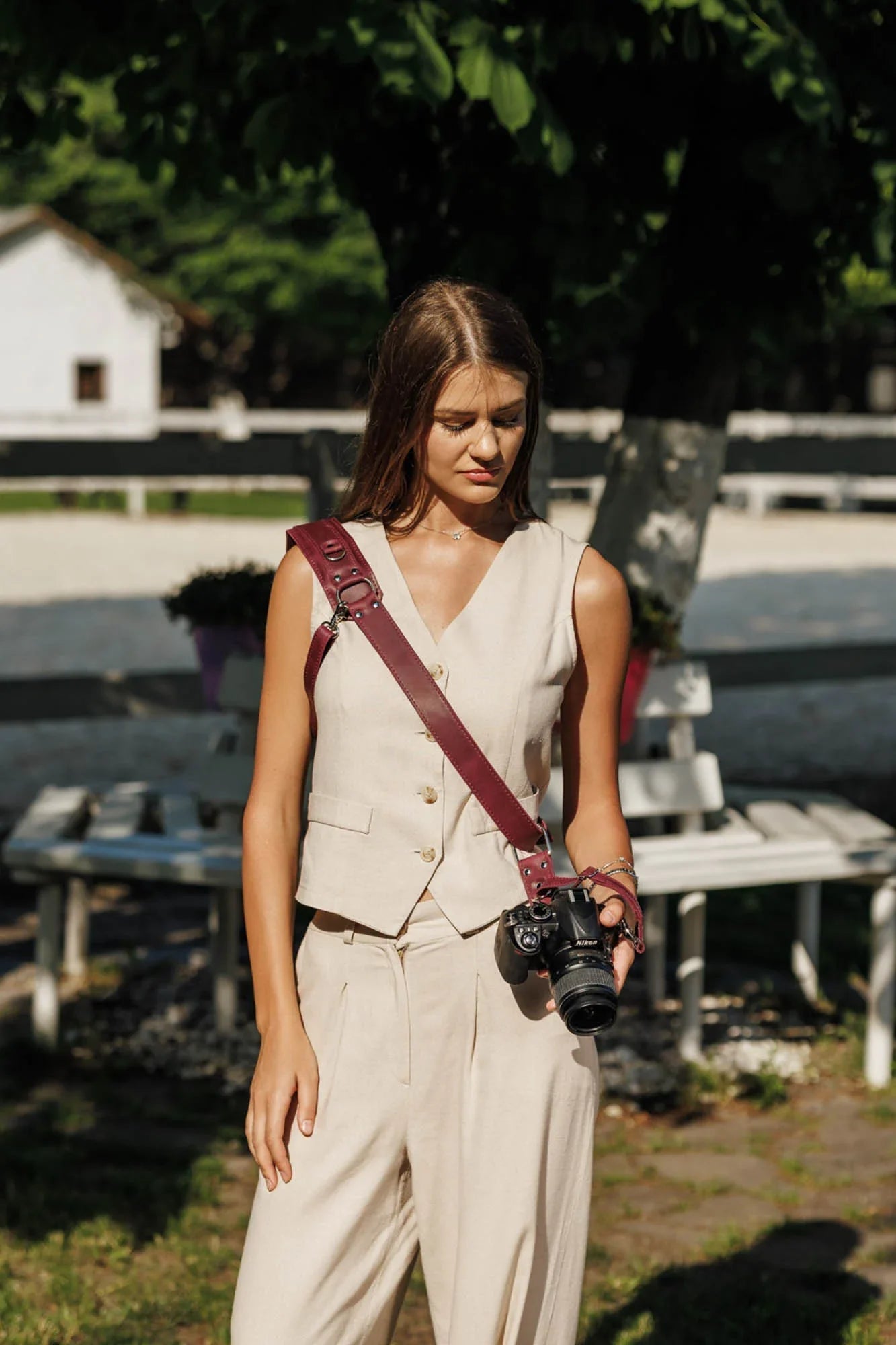 Одноремінна шкіряна портупея створена для фотографів, які цінують свободу руху й міцність матеріалів. Виготовлена з матової воскової шкіри, вона забезпечує надійну фіксацію камери без компромісів щодо комфорту.