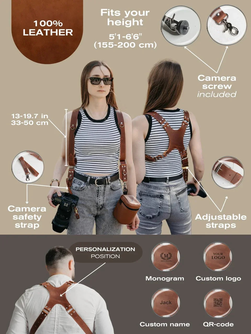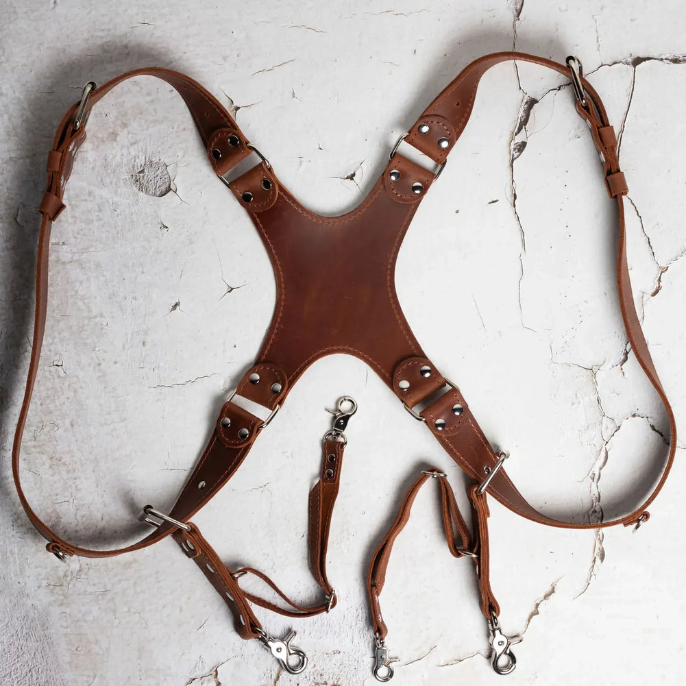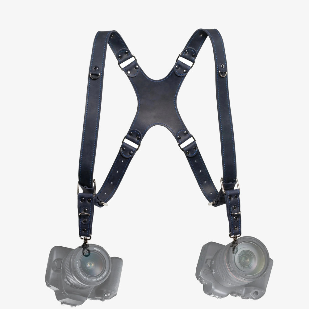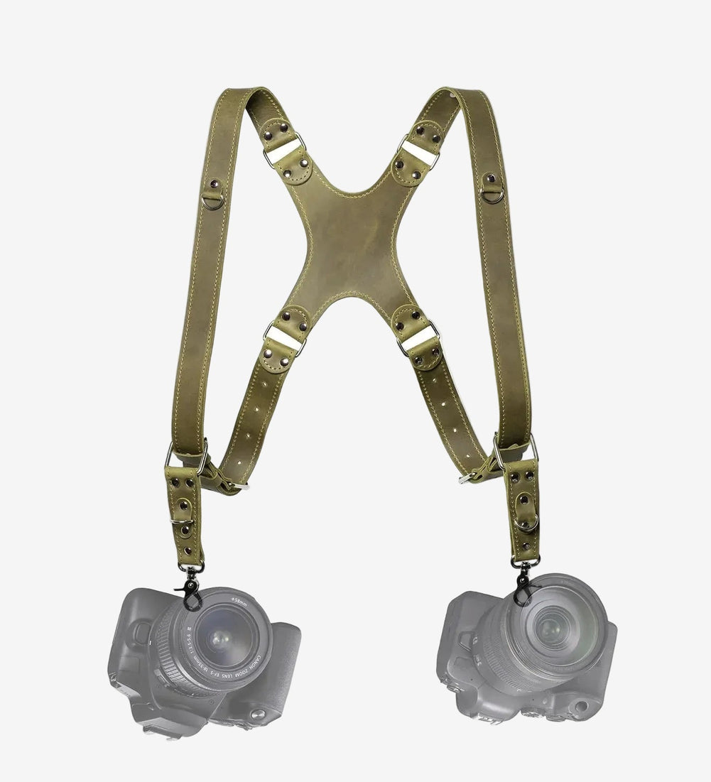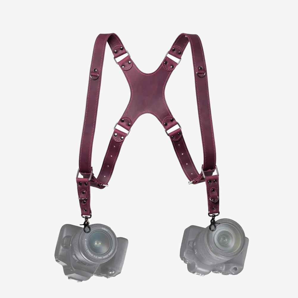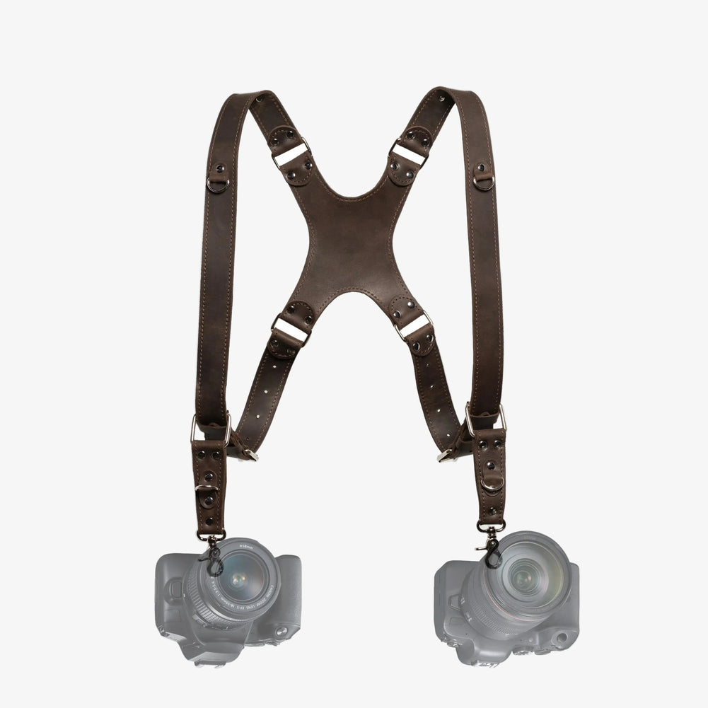 Створена для професійних та івент-фотографів, ця система дозволяє зручно та безпечно носити дві камери (або камеру й кейс для об’єктива). Виготовлена зі 100% натуральної матової шкіри з ефектом вінтажу (Crazy Horse), вона забезпечує довговічність, ергономічну підтримку та швидкий доступ до техніки під час тривалих зйомок.