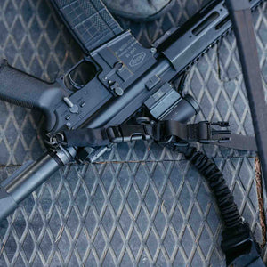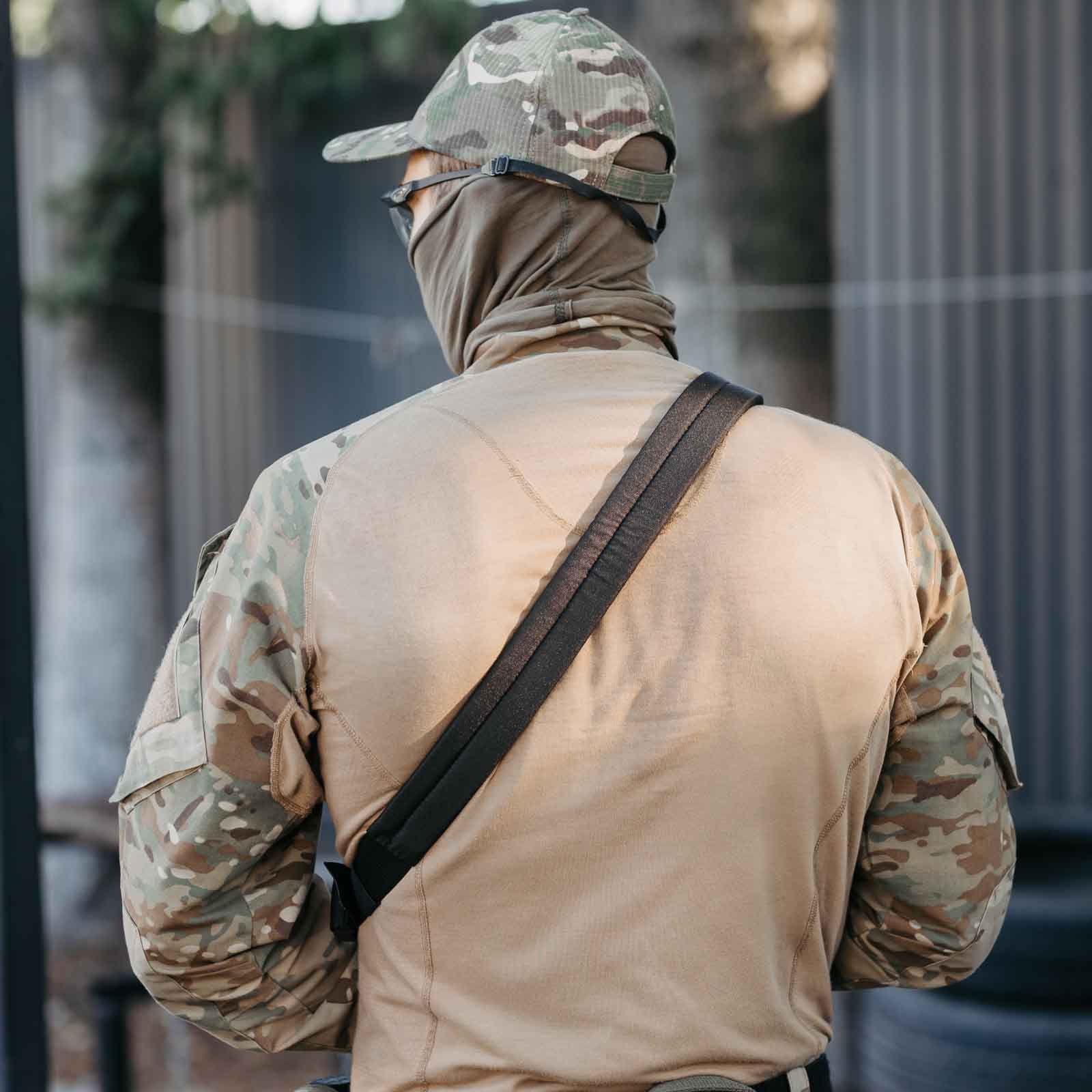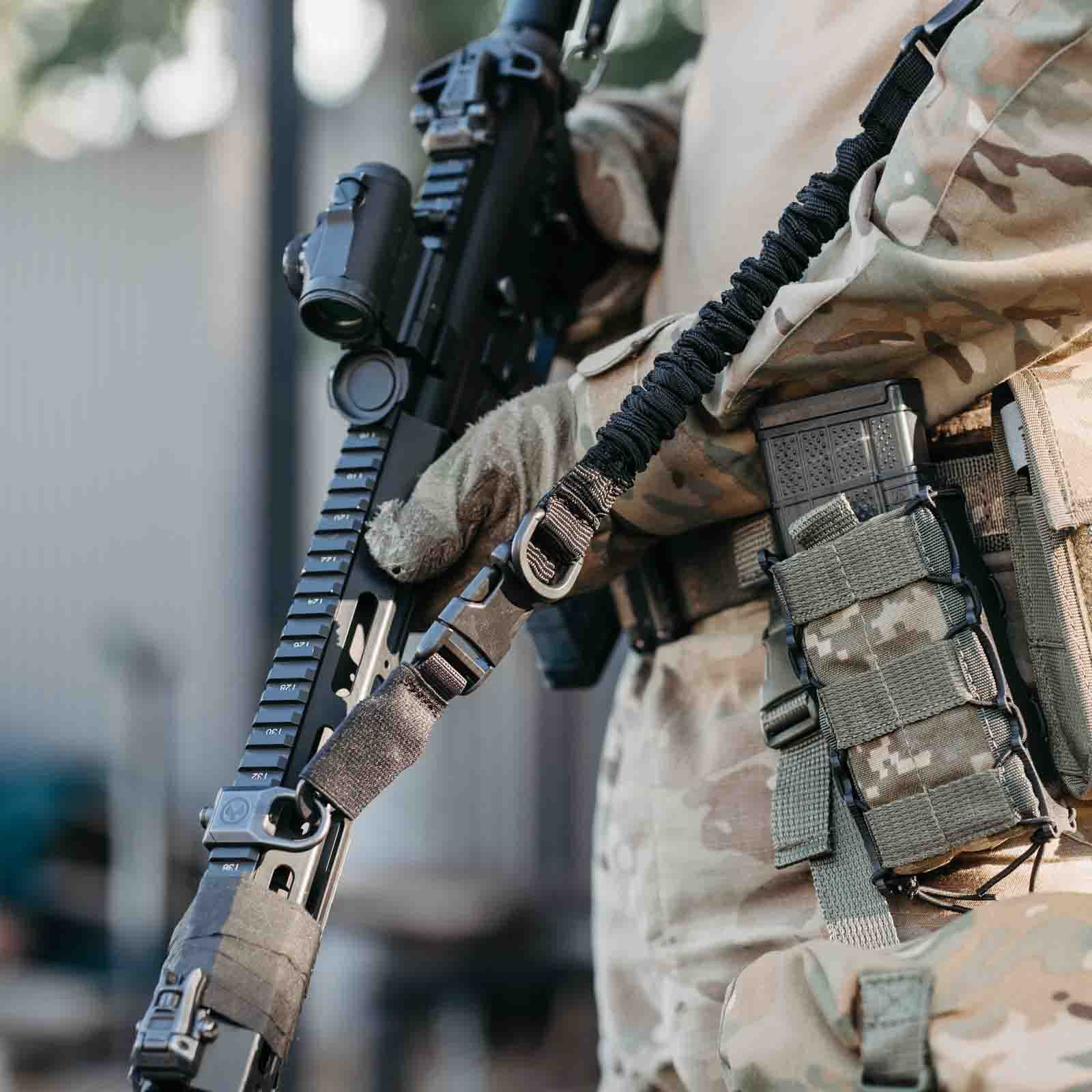 Двоточковий ремінь з еластичною стропою та м’яким плечем виготовлений із надійного, міцного матеріалу типу кордура, що забезпечує високу стійкість до зношування. Конструкція додає комфорту при використанні, а загальна довжина ременя 170 см. За необхідності, ви можете легко скоротити його довжину.