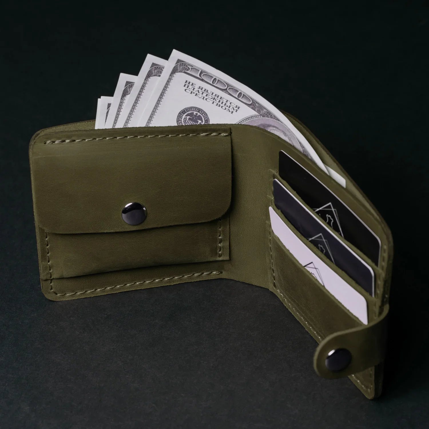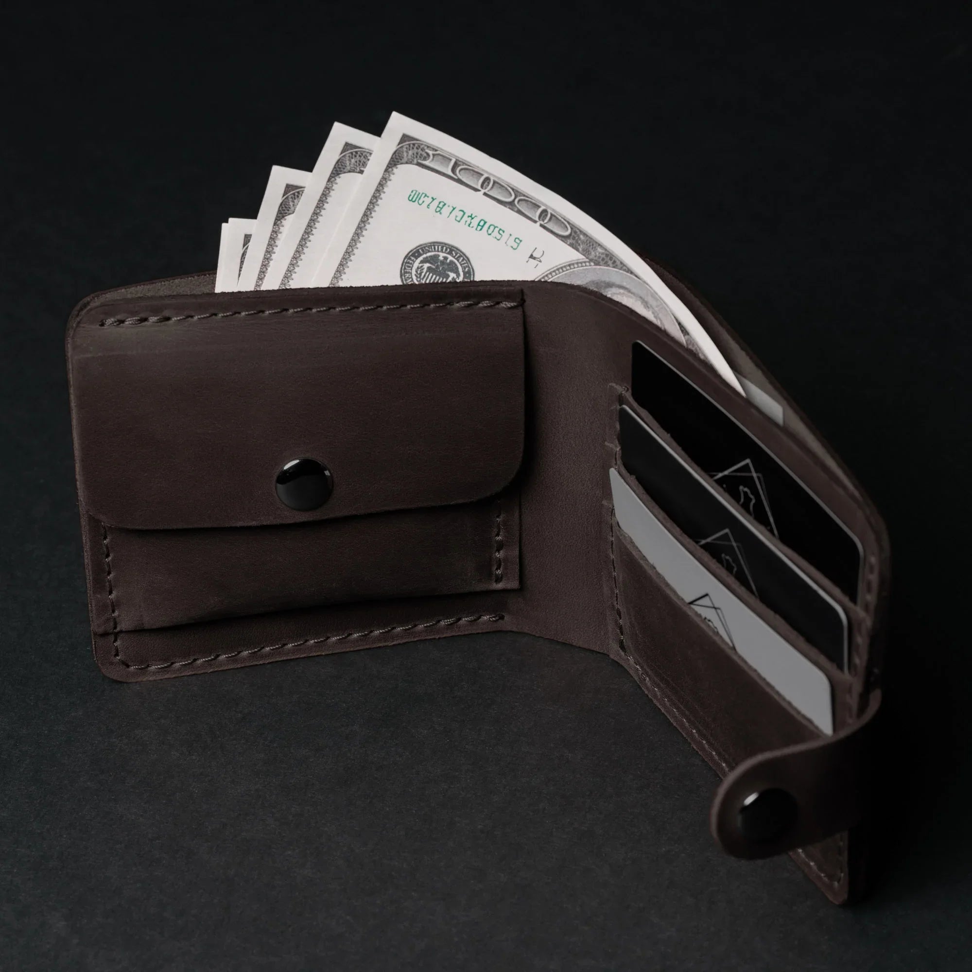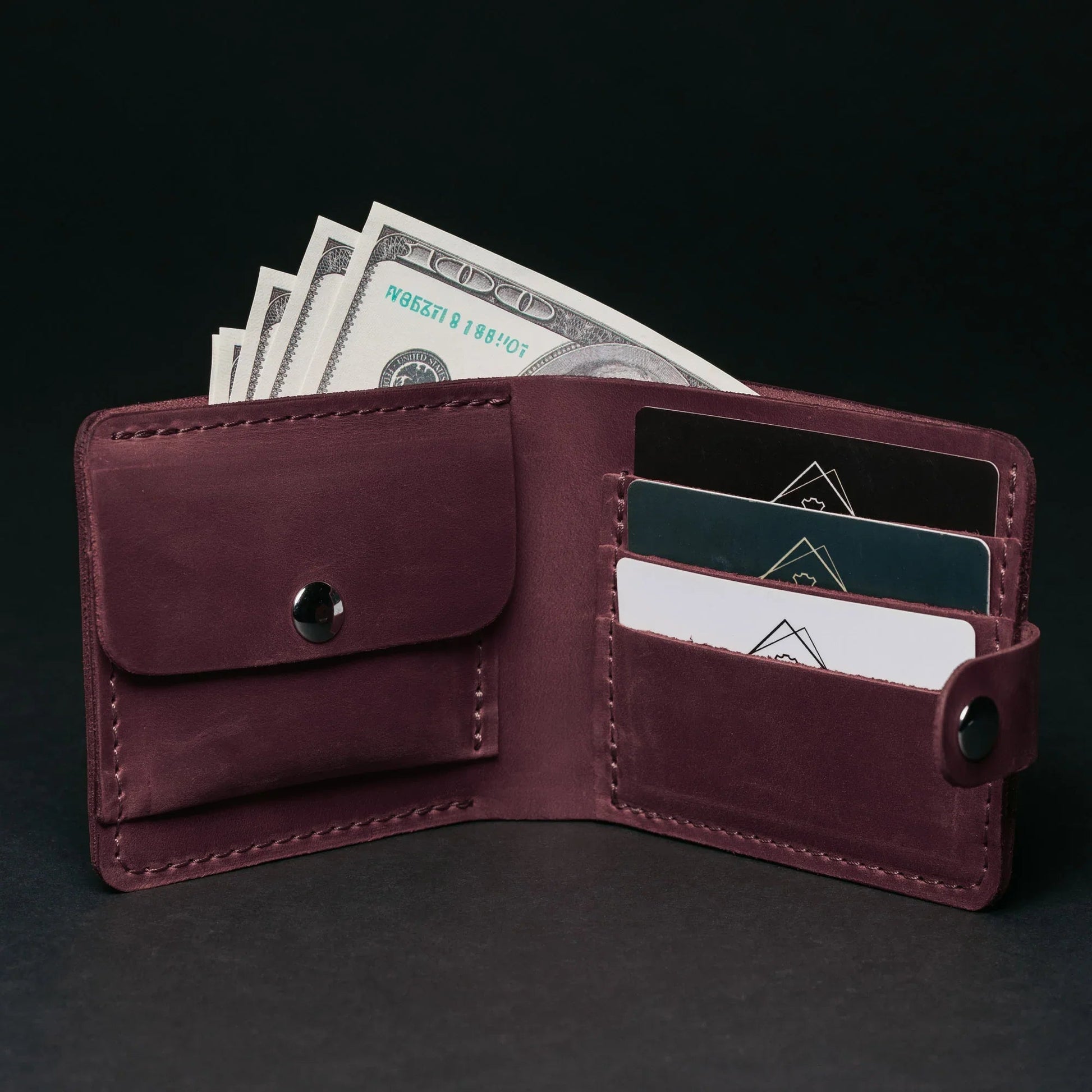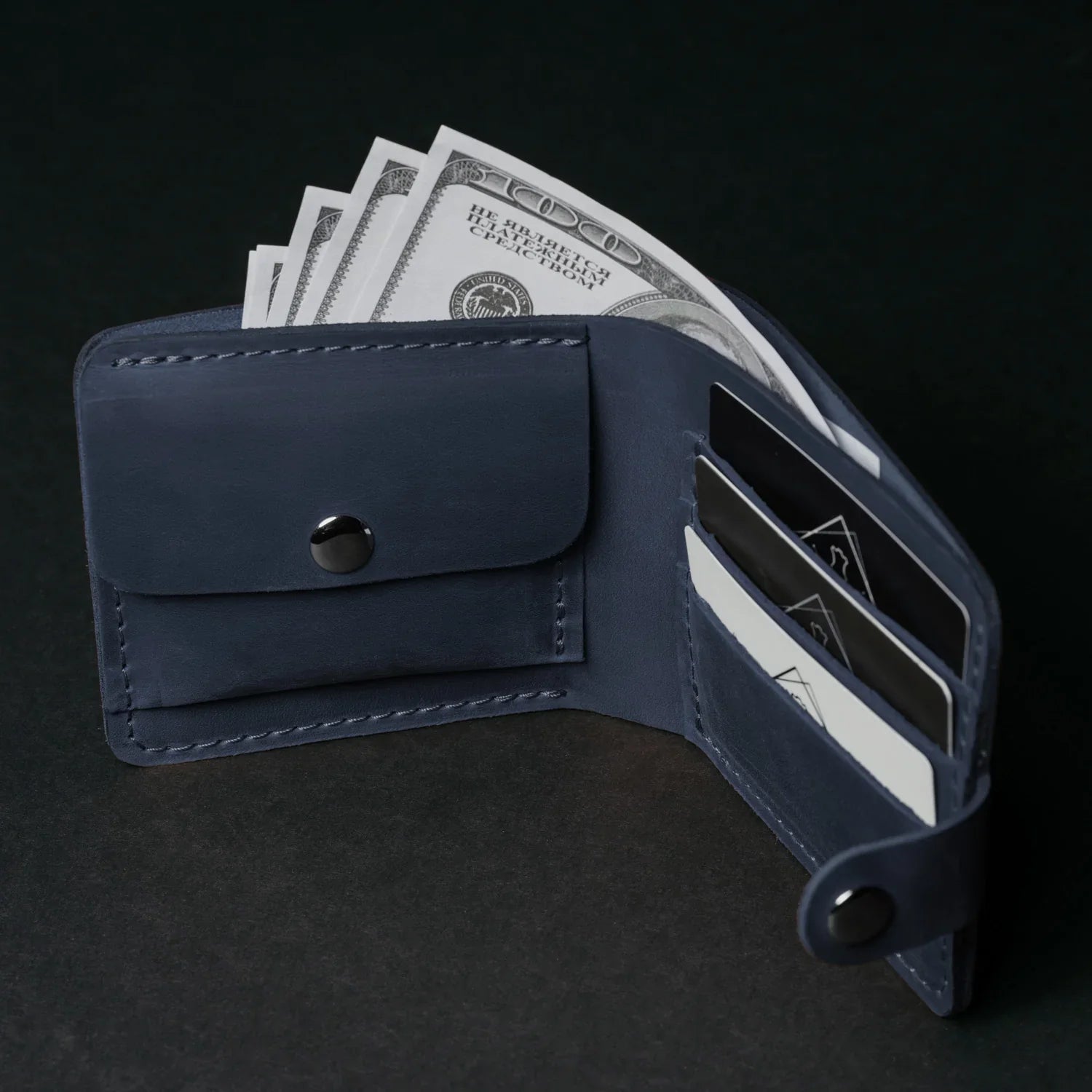 - Біфолд має 1 відділ для купюр і 3 слоти під картки. У ньому є кишеня для монет і дрібничок.