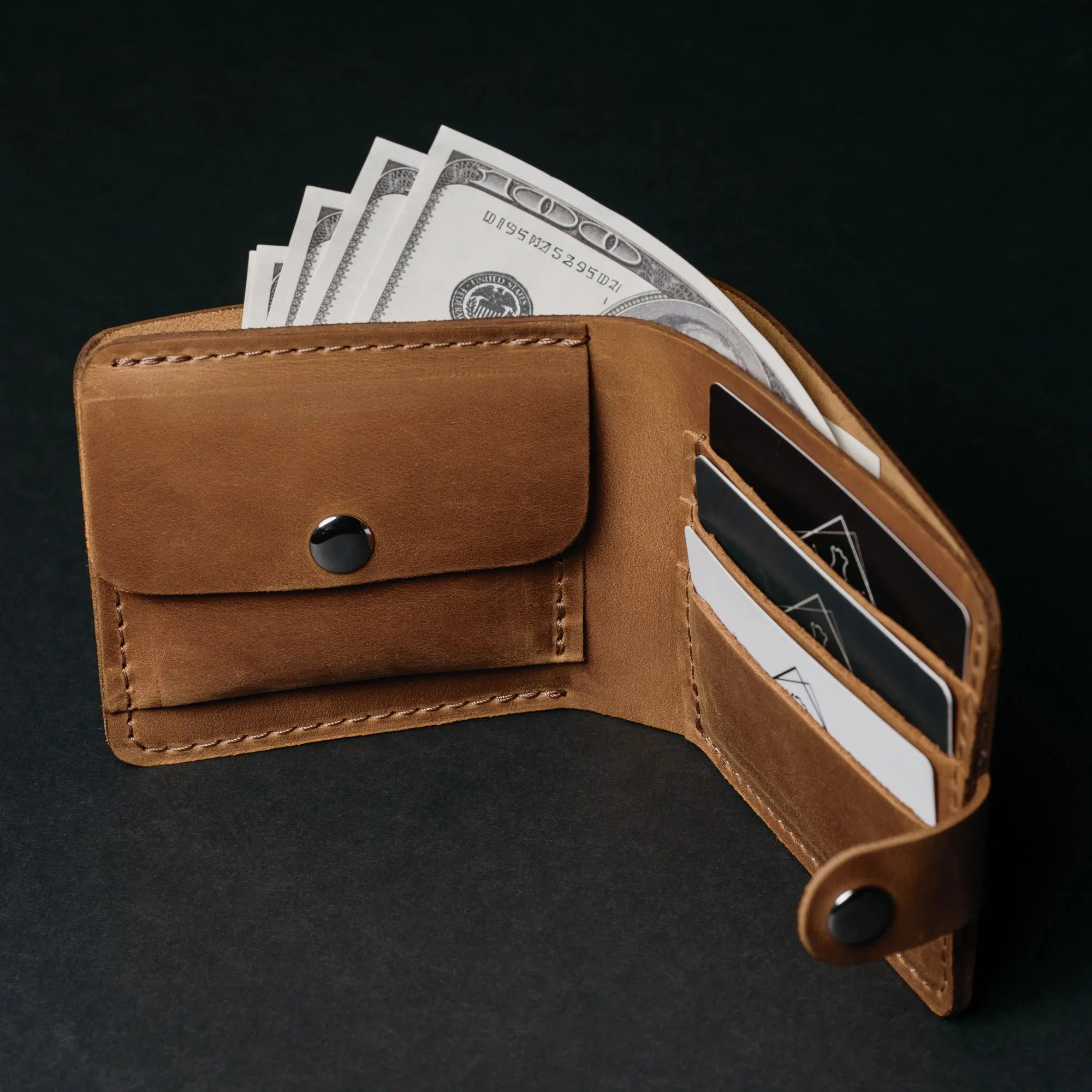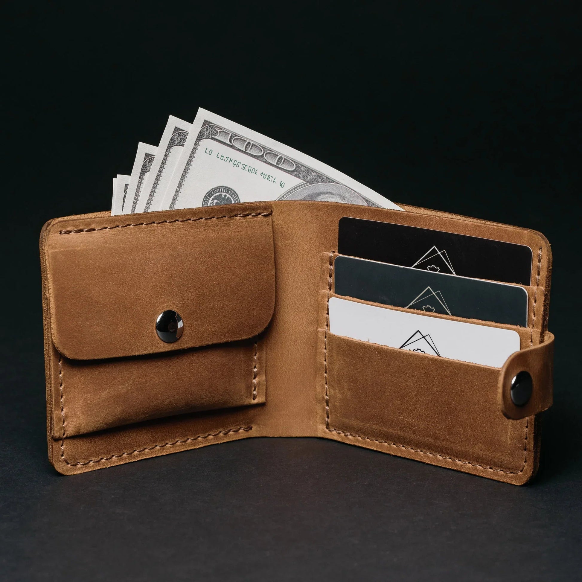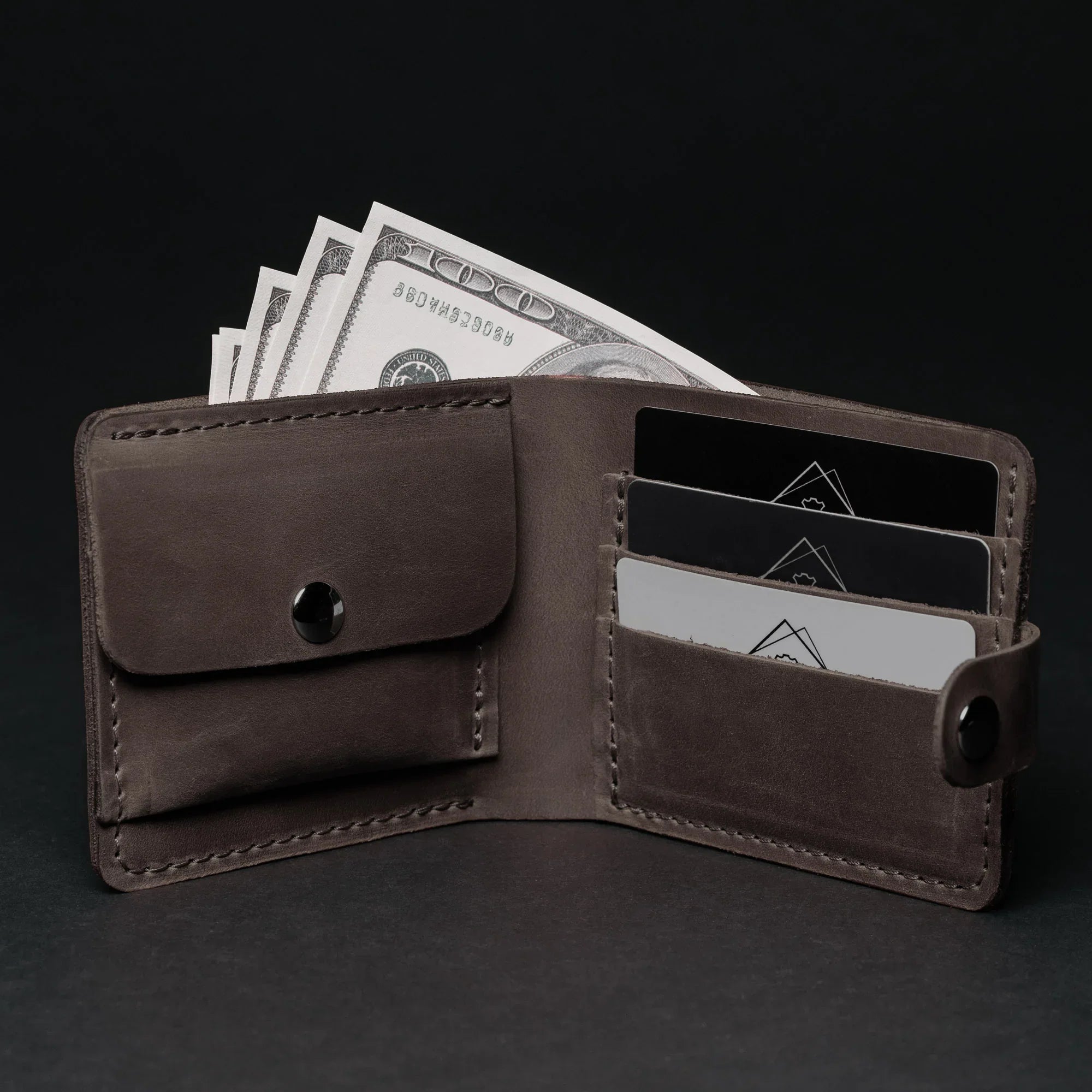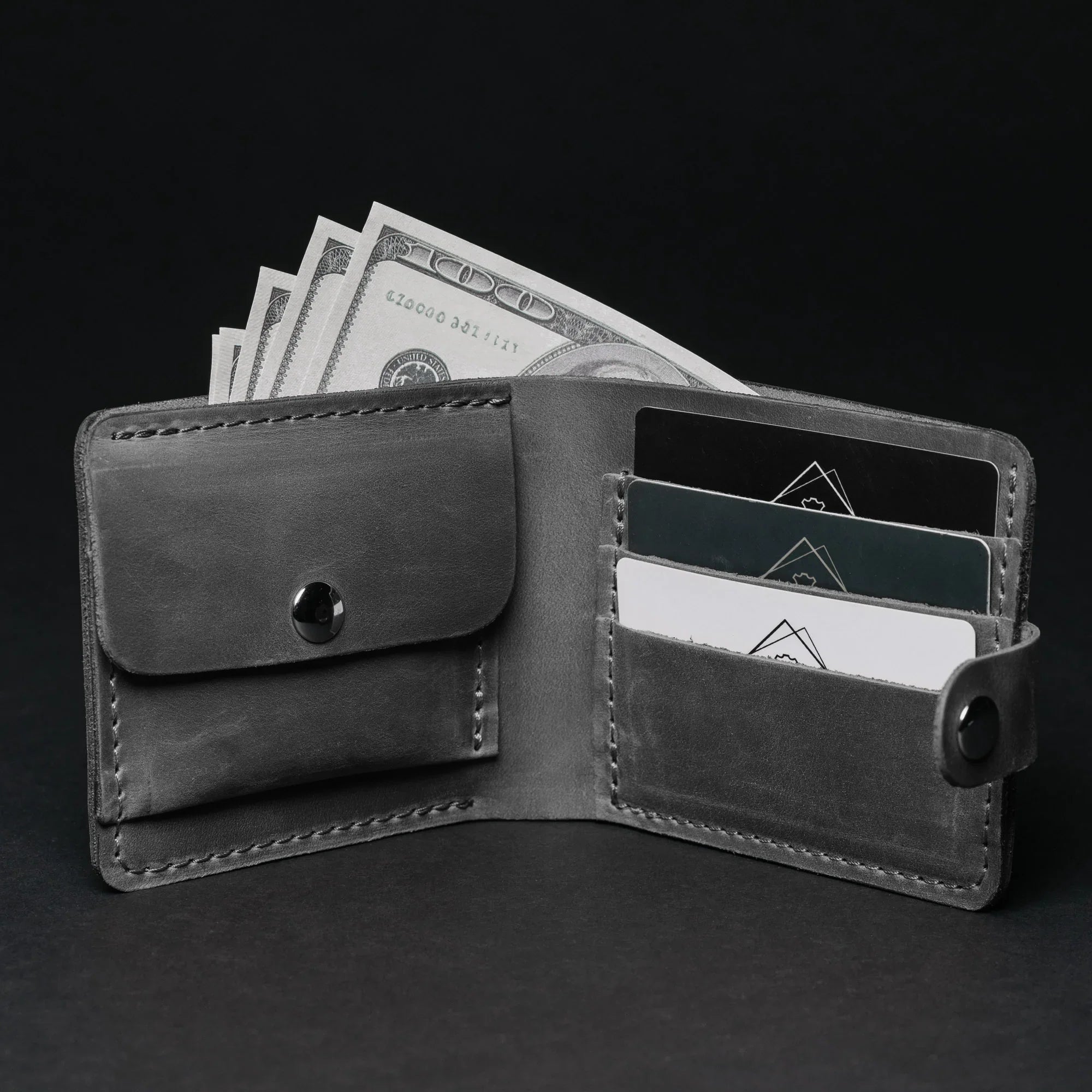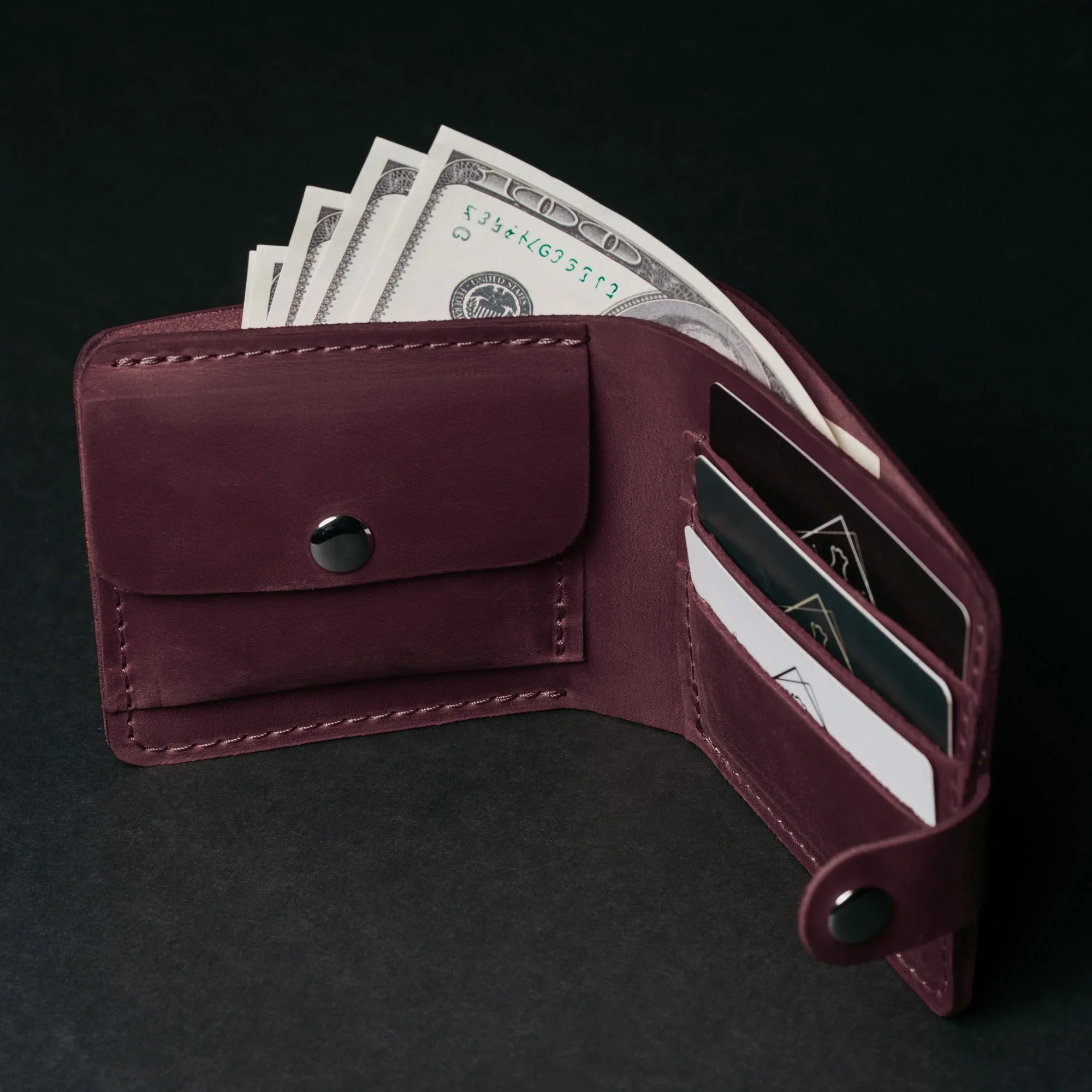 - Біфолд має 1 відділ для купюр і 3 слоти під картки. У ньому є кишеня для монет і дрібничок.