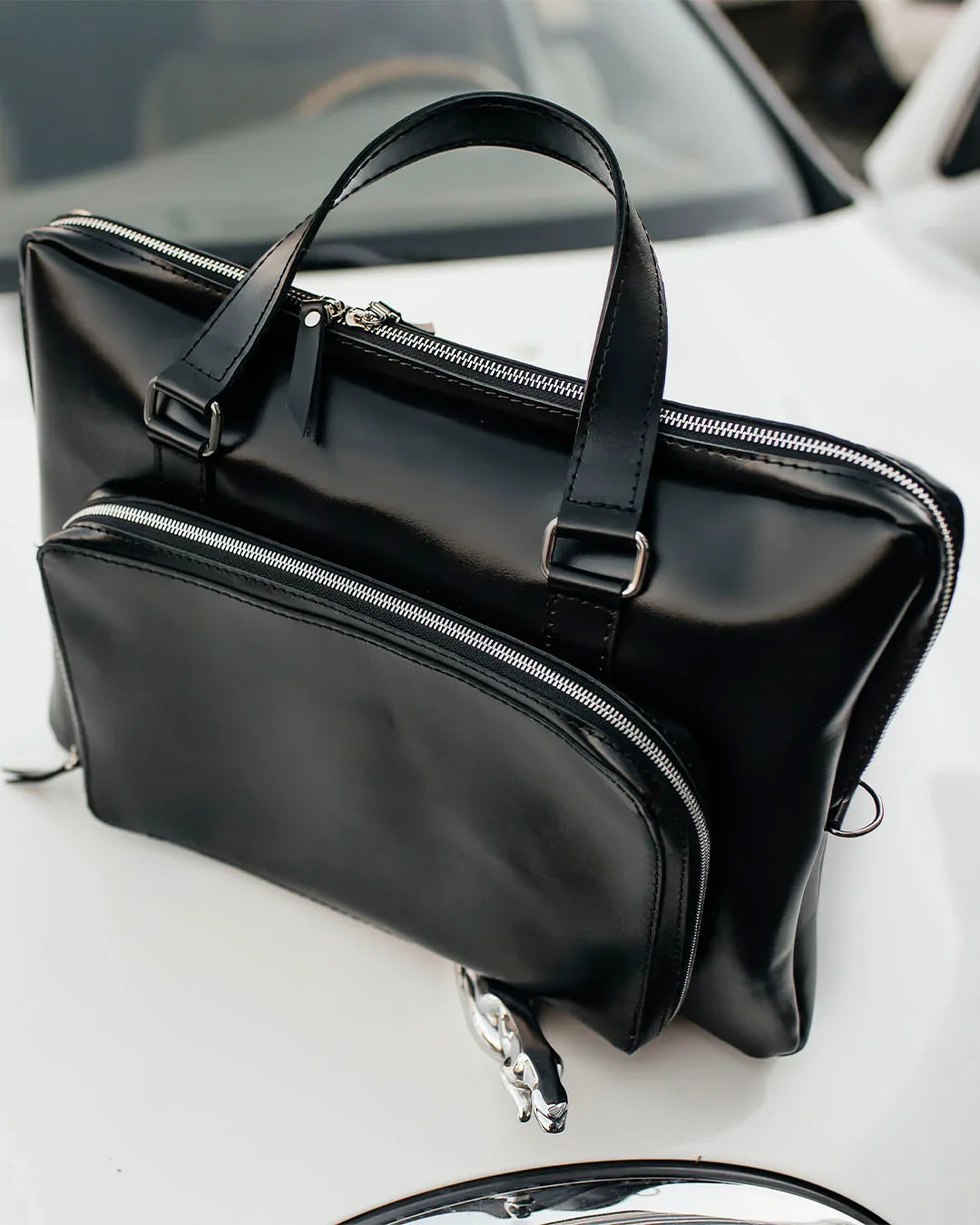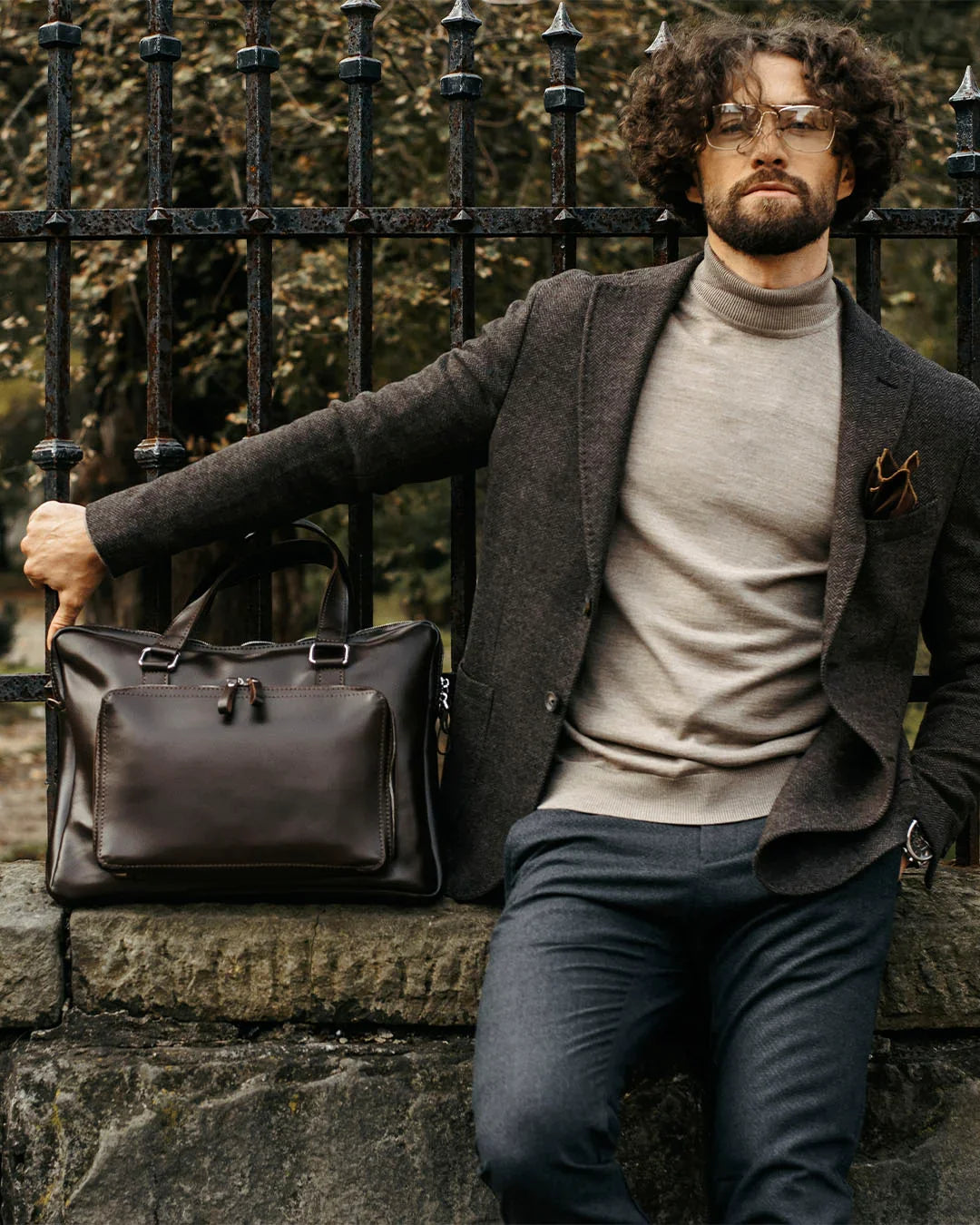 Універсальний портфель з натуральної шкіри Woke – підходить для роботи в офісі, відряджень, ділових зустрічей і заходів. Модель досить містка та об'ємна. У неї поміститься все, що вам знадобиться: макбук, планшет, смартфон, зарядки і дроти, документи, блокноти та безліч дрібниць.