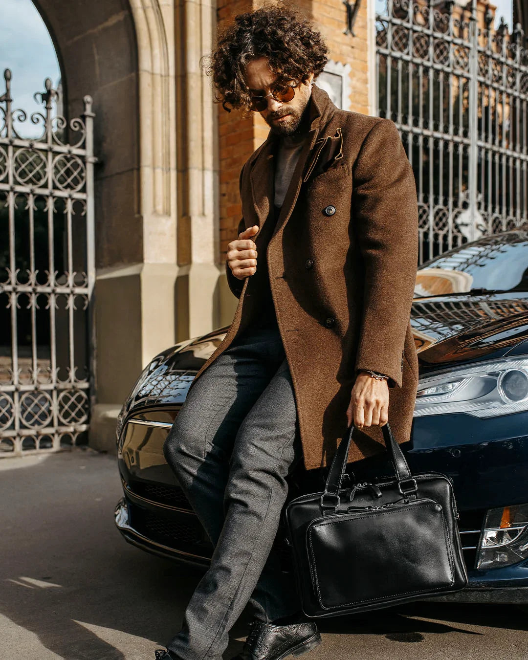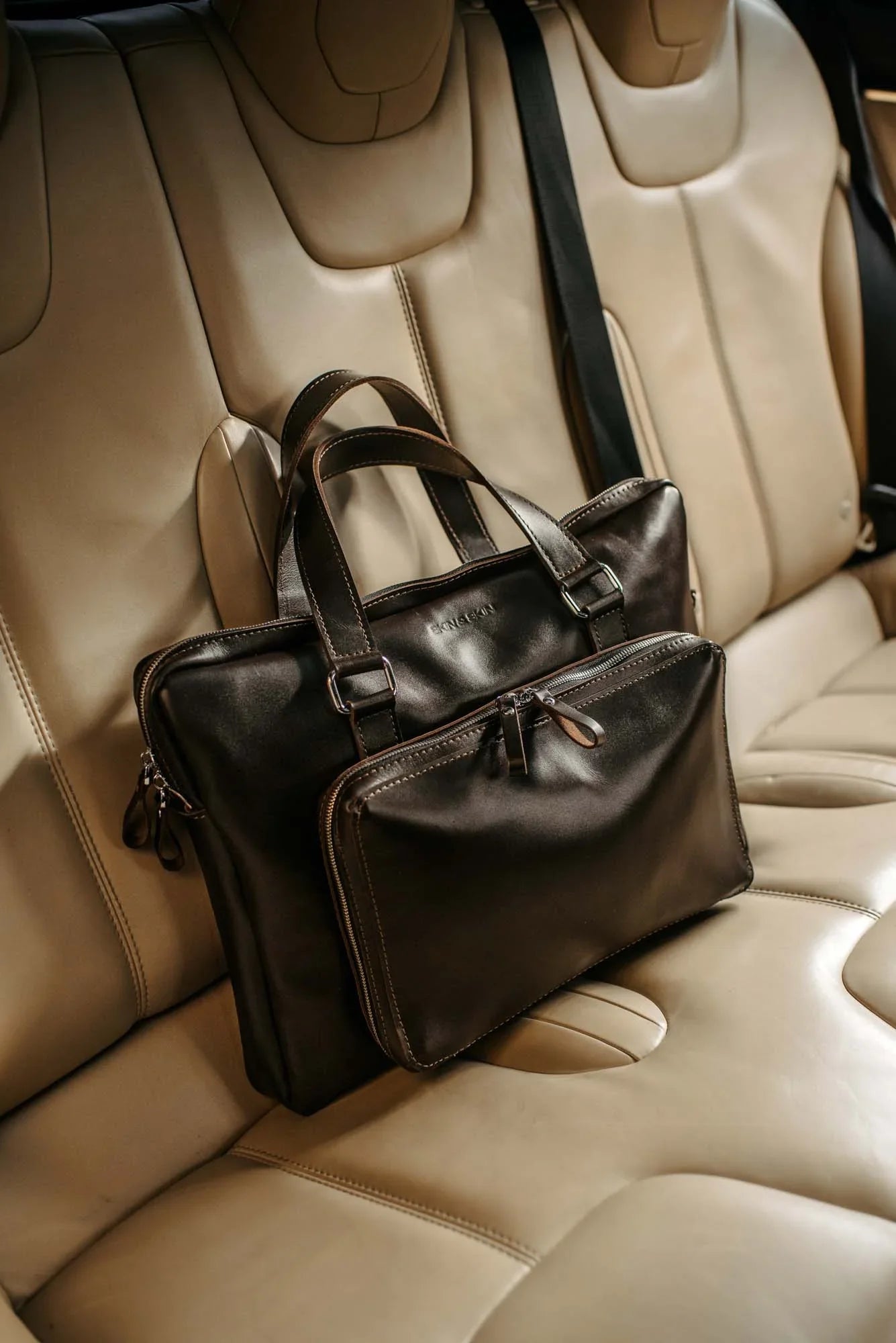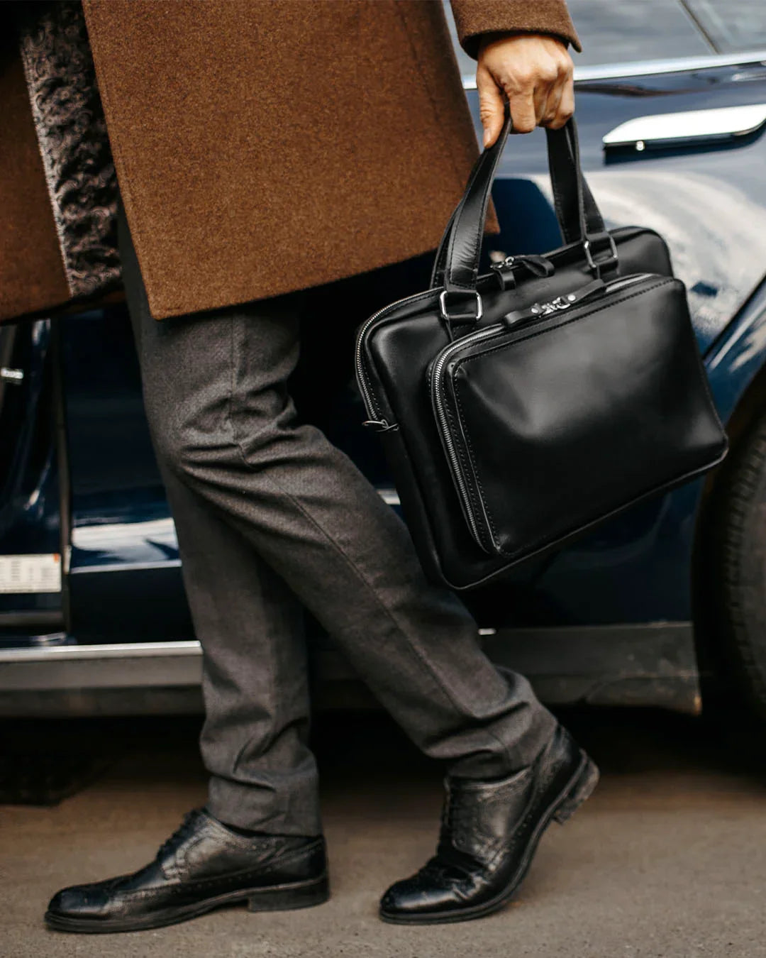 Чоловічий портфель з натуральної шкіри виготовлений у 3 розмірах. У кожен поміщаються документи формату А4. Кожен розмір призначений для певної діагоналі ноутбука: