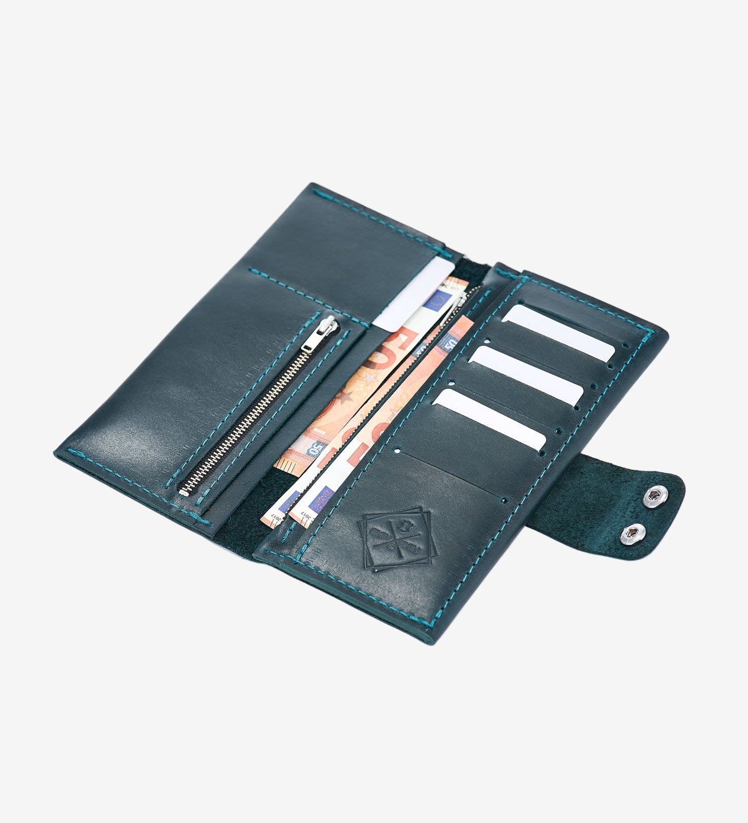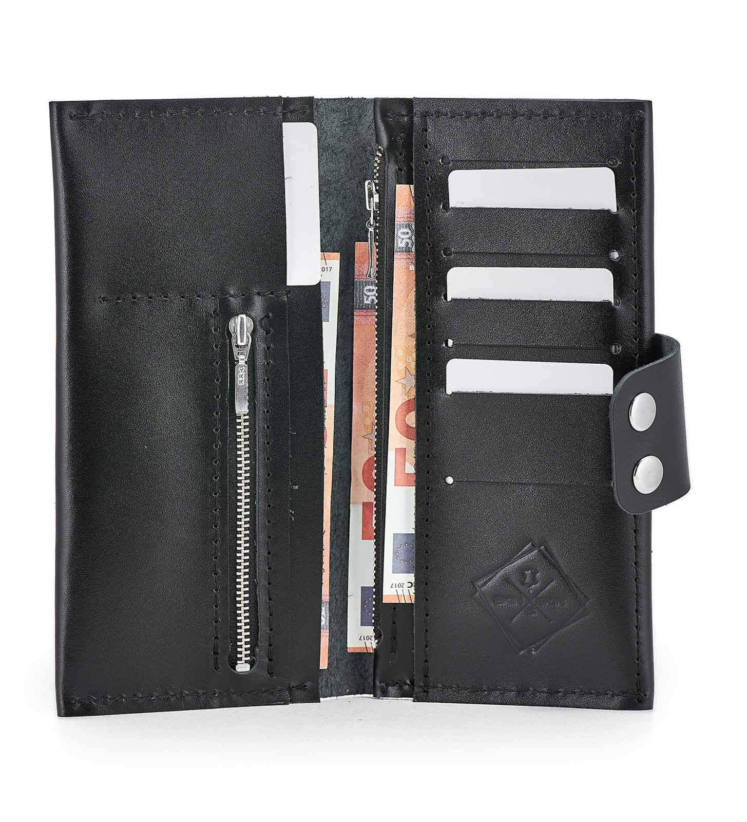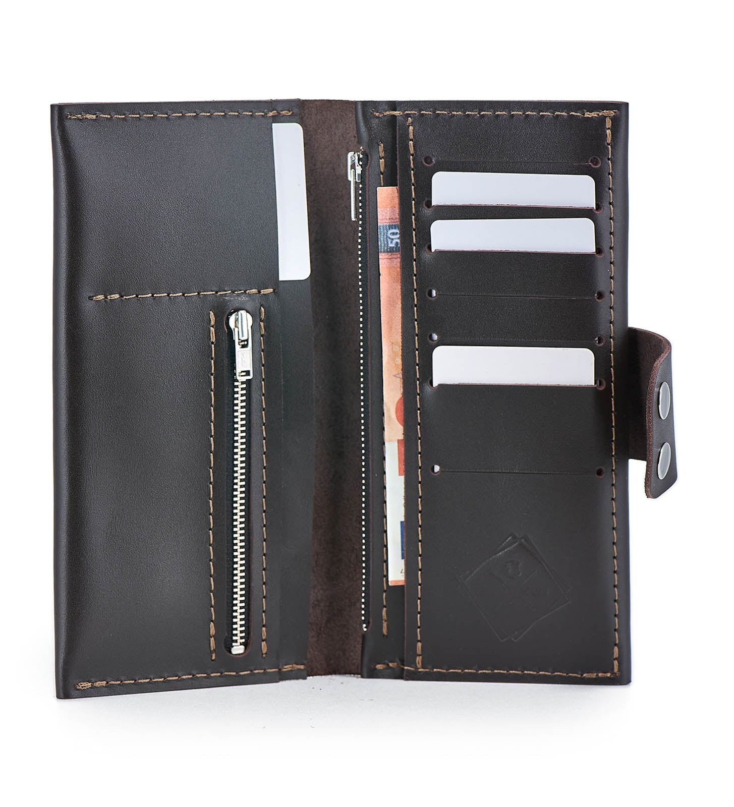 - Портмоне, як і тревел-кейс, має 3 відділи під різні купюри, чеки, квитанції. У виробі є 2 кишеньки на блискавці. Всього має 9 слотів під картки, в кожен із яких можна вмістити ще по декілька штук.