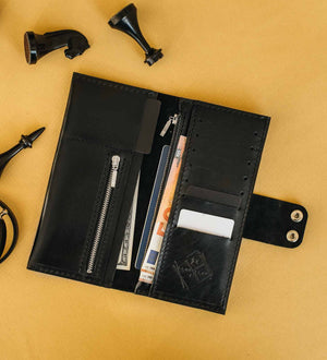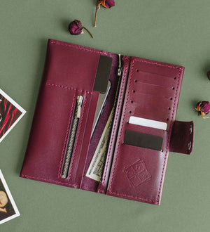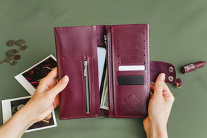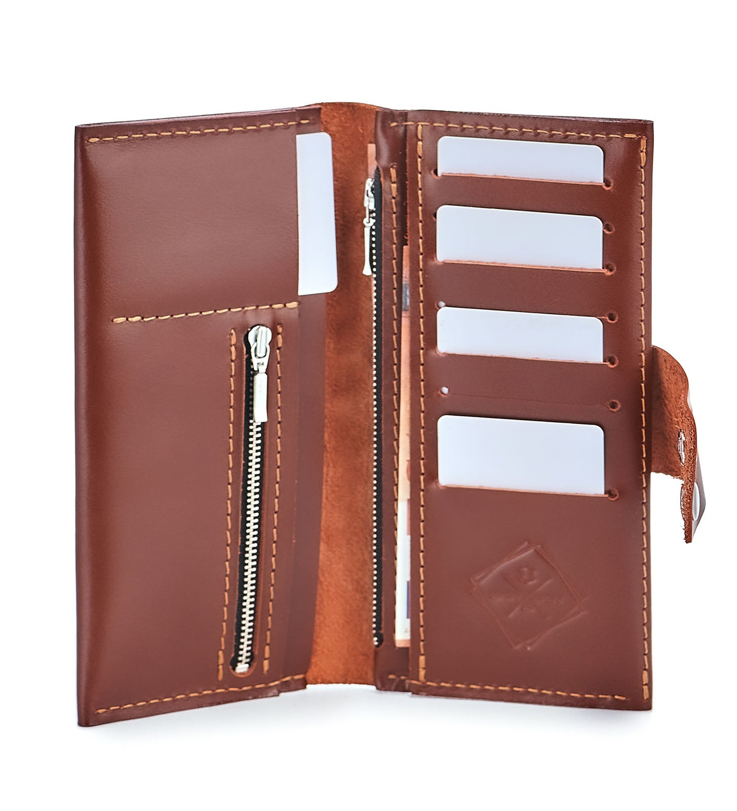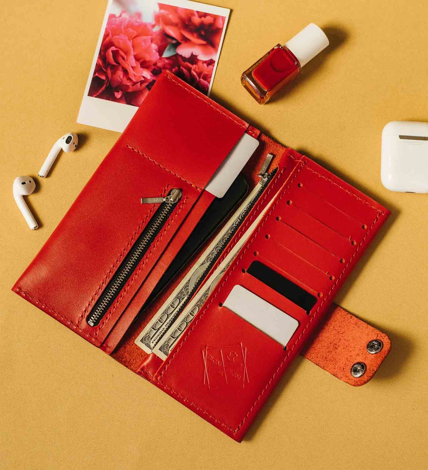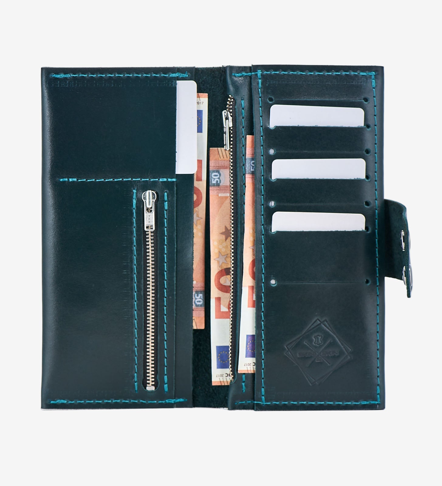 - Портмоне, як і тревел-кейс, має 3 відділи під різні купюри, чеки, квитанції. У виробі є 2 кишеньки на блискавці. Всього має 9 слотів під картки, в кожен із яких можна вмістити ще по декілька штук.