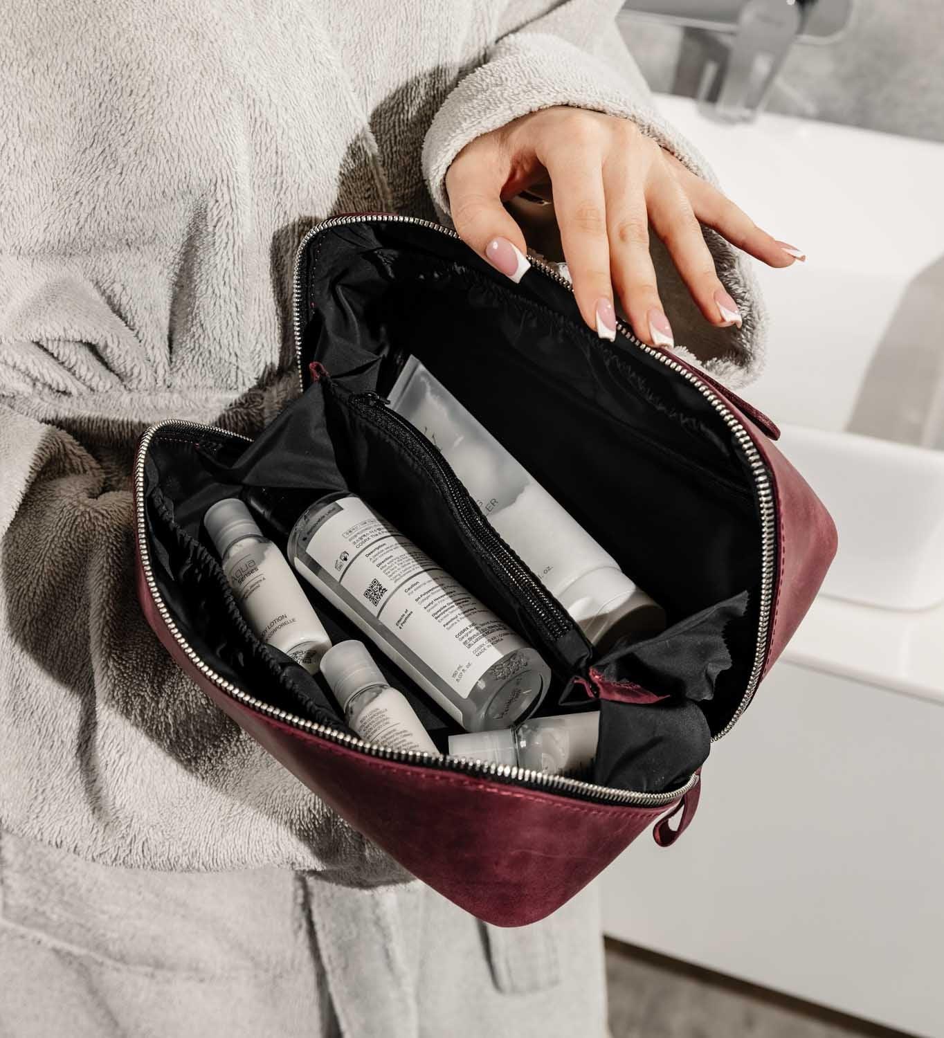 • Акуратна строчка та природна текстура шкіри роблять кожну косметичку унікальною.