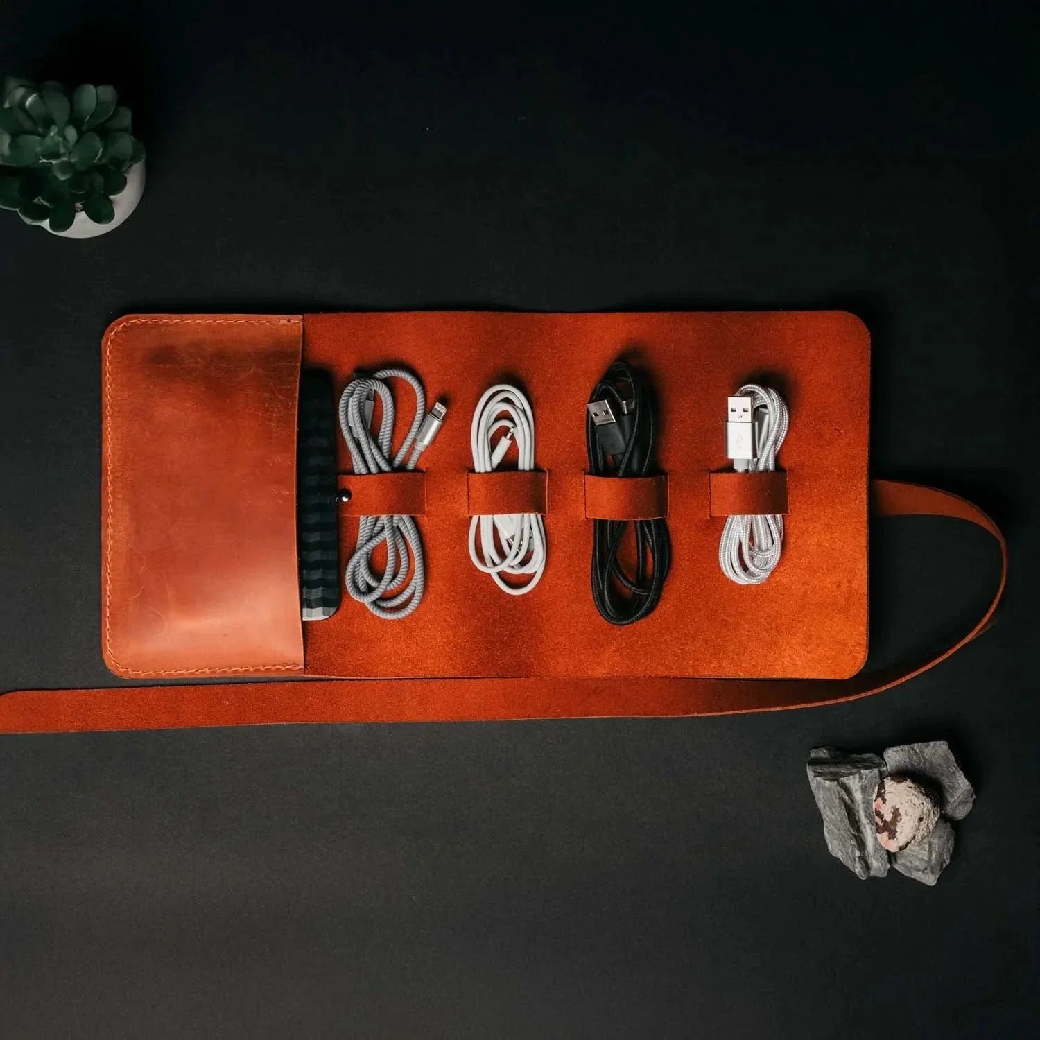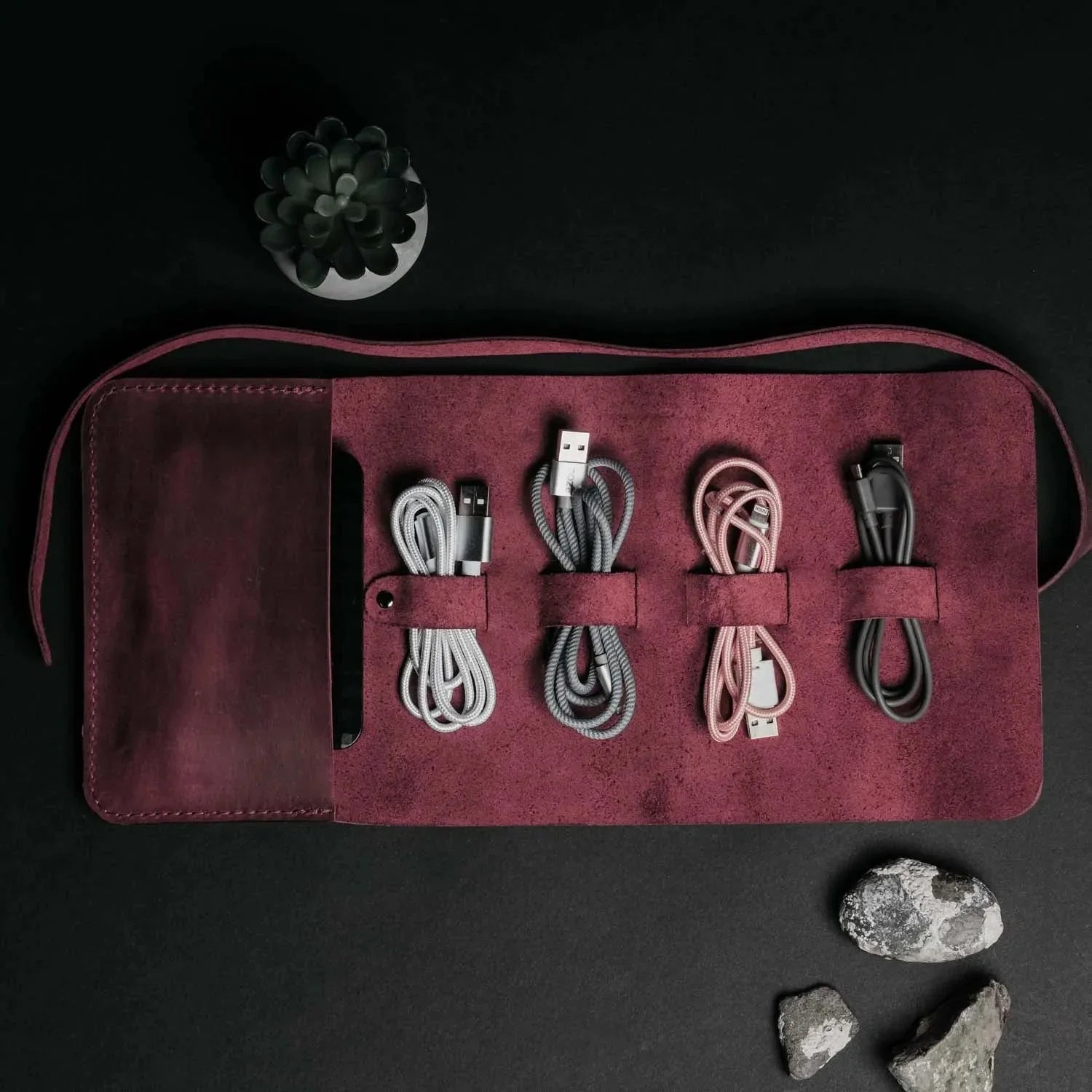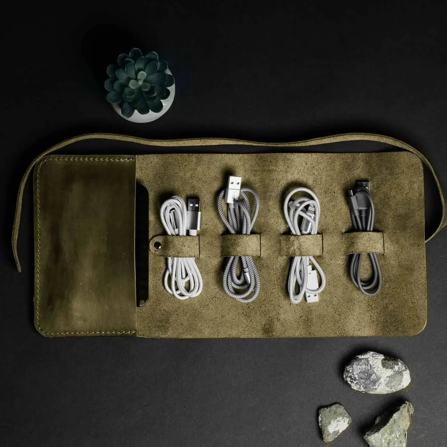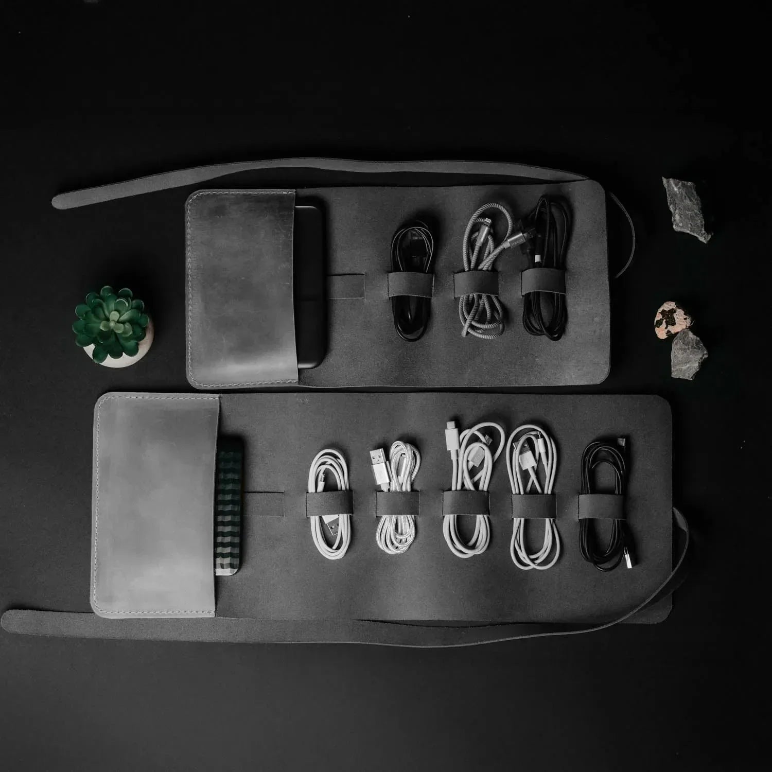Втомилися від заплутаних кабелів і безладу у рюкзаку чи шухляді? Цей рол із натуральної шкіри Crazy Horse стане стильним і надійним способом зберігати зарядні дроти, навушники, USB-кабелі та дрібні аксесуари. Матова, вощена поверхня з вінтажним ефектом робить його не просто зручним, а й унікальним – з часом шкіра набуває патини та індивідуального характеру.