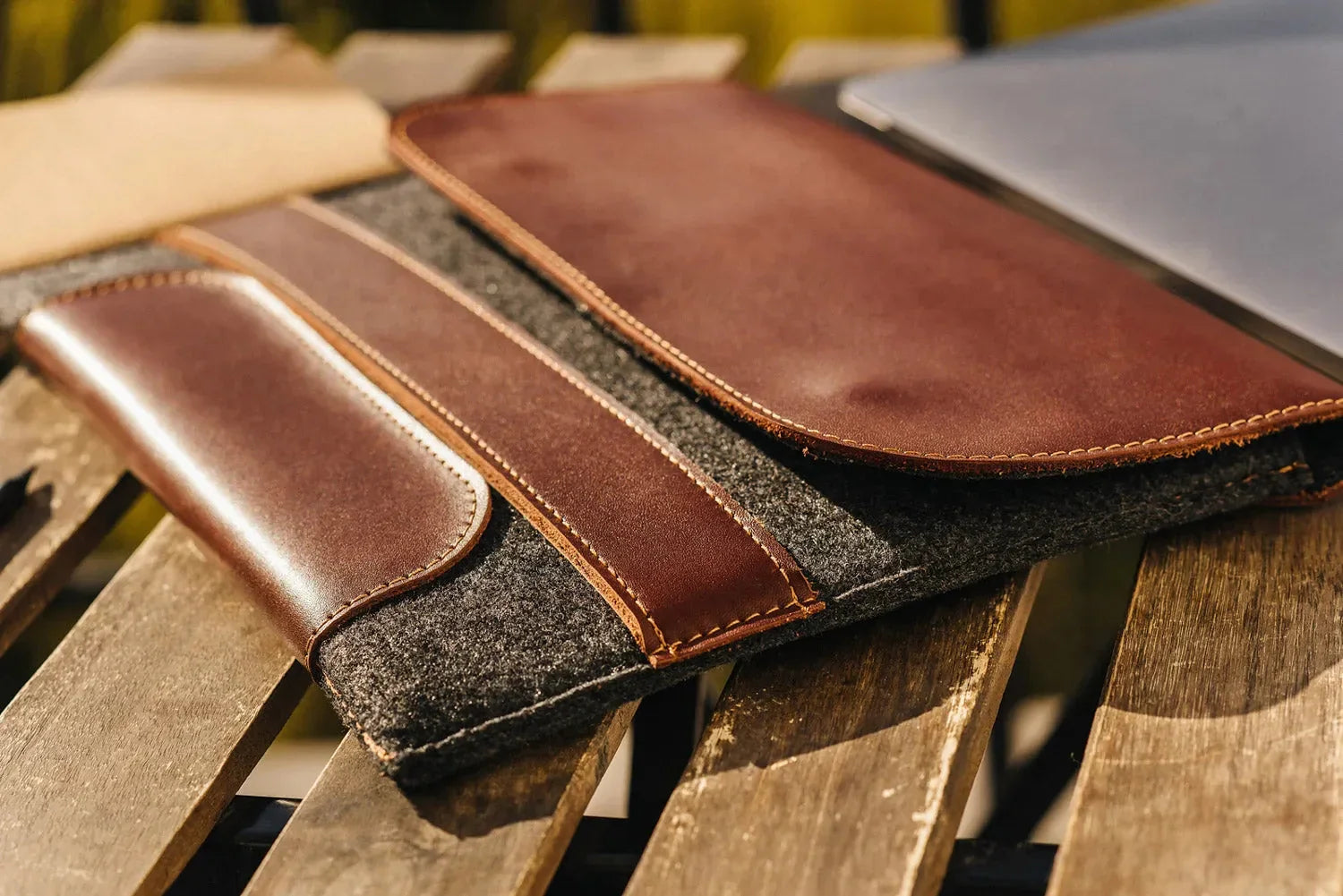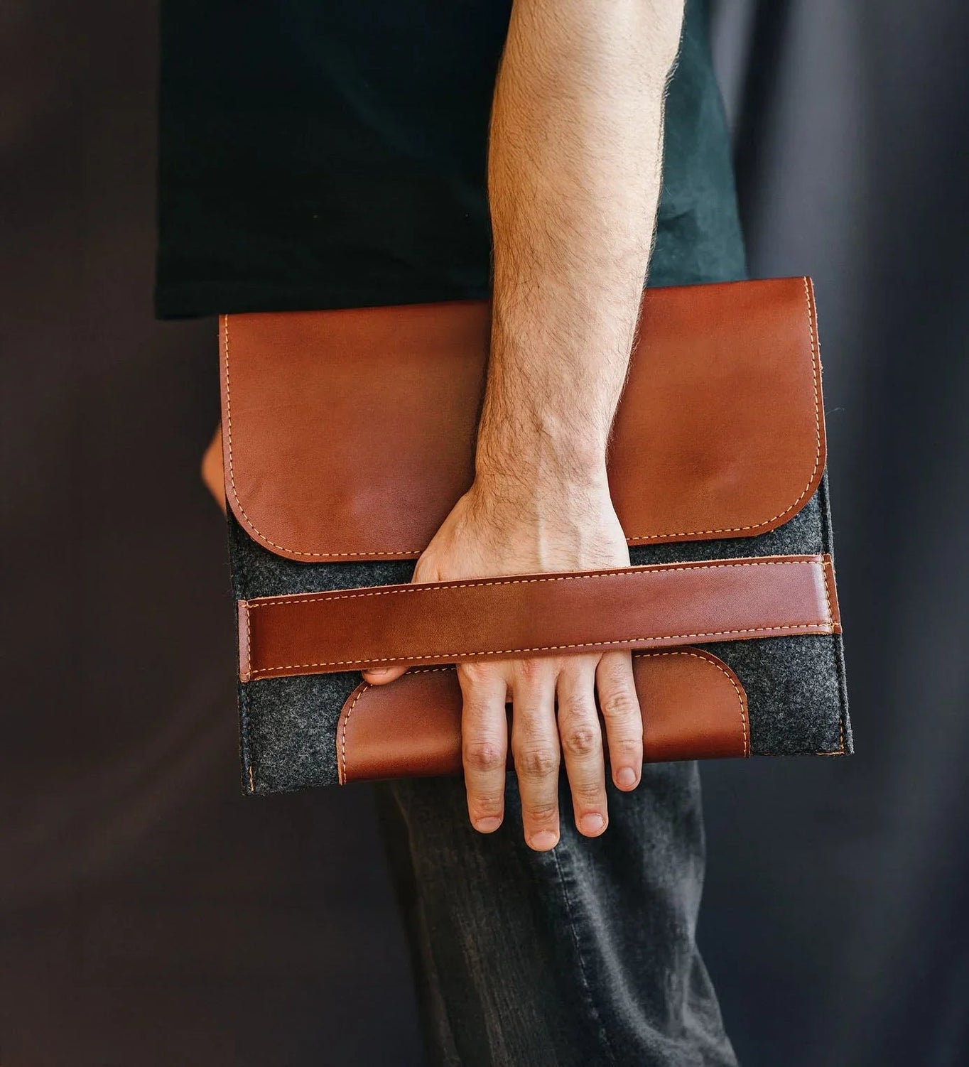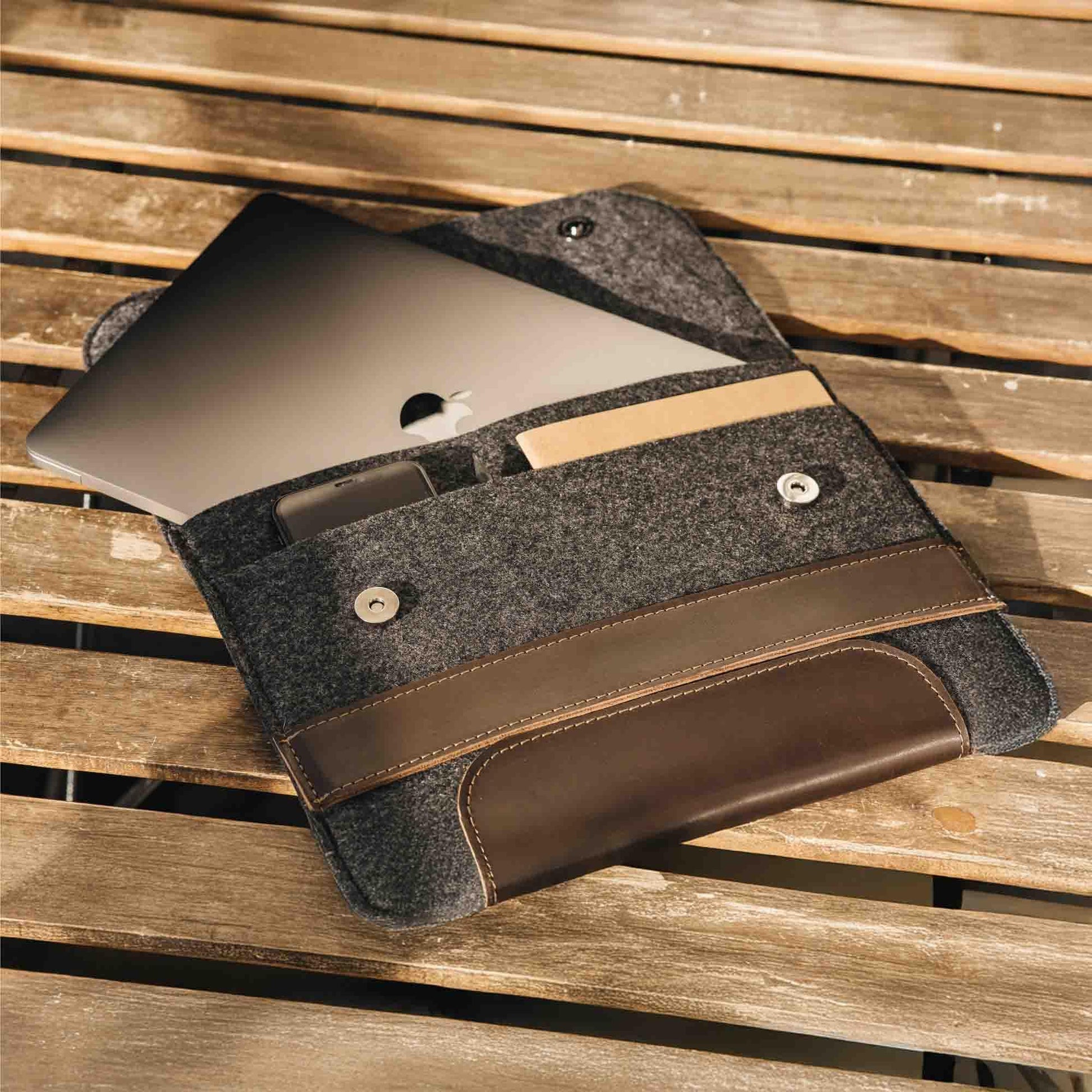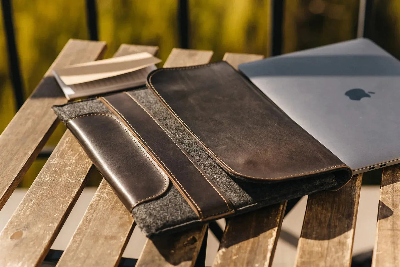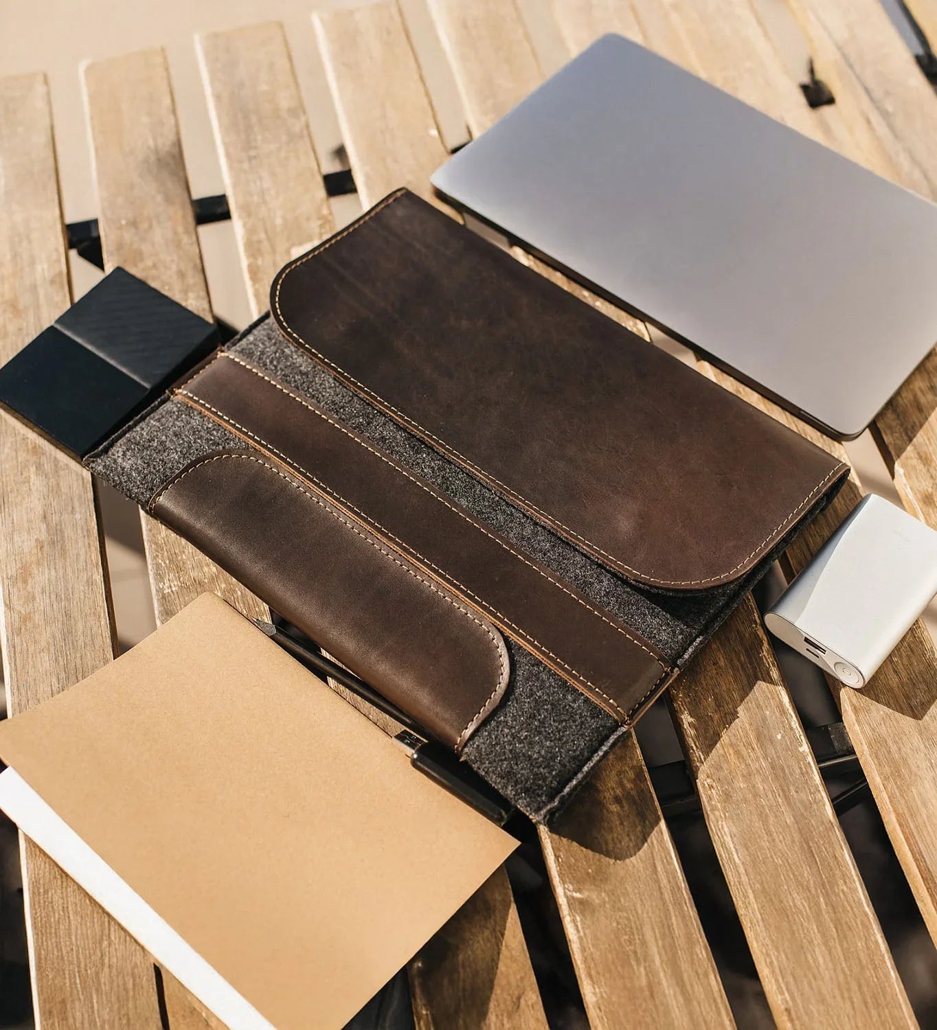 Цей шкіряний чохол із фетром поєднує захист, функціональність і можливість персоналізації. Підійде як для роботи, так і для подорожей.