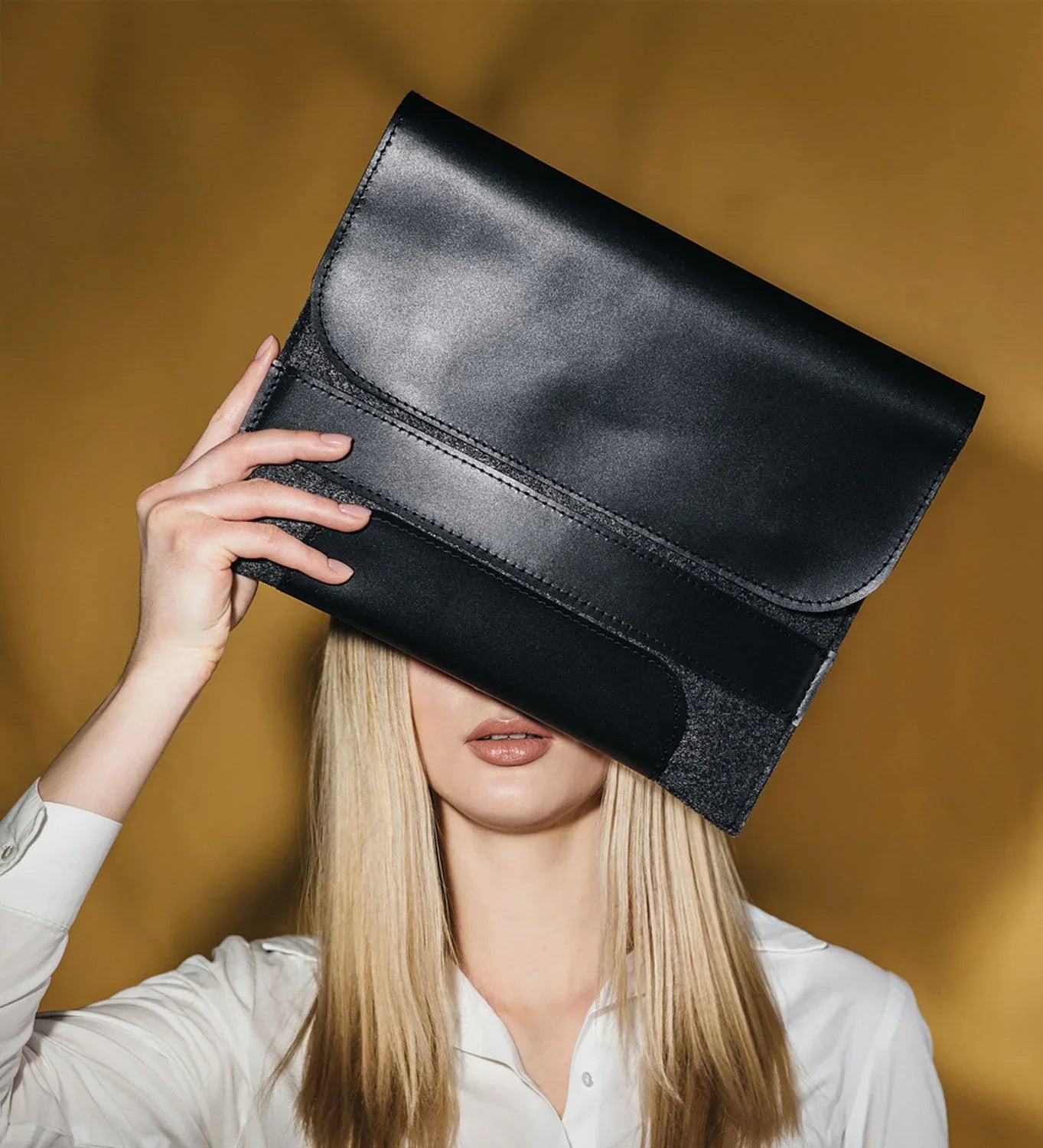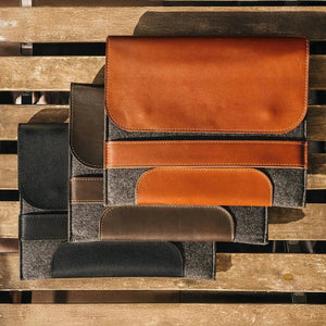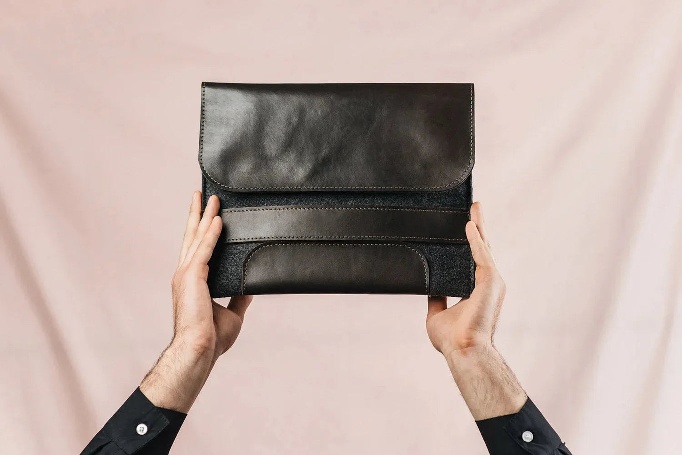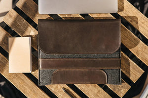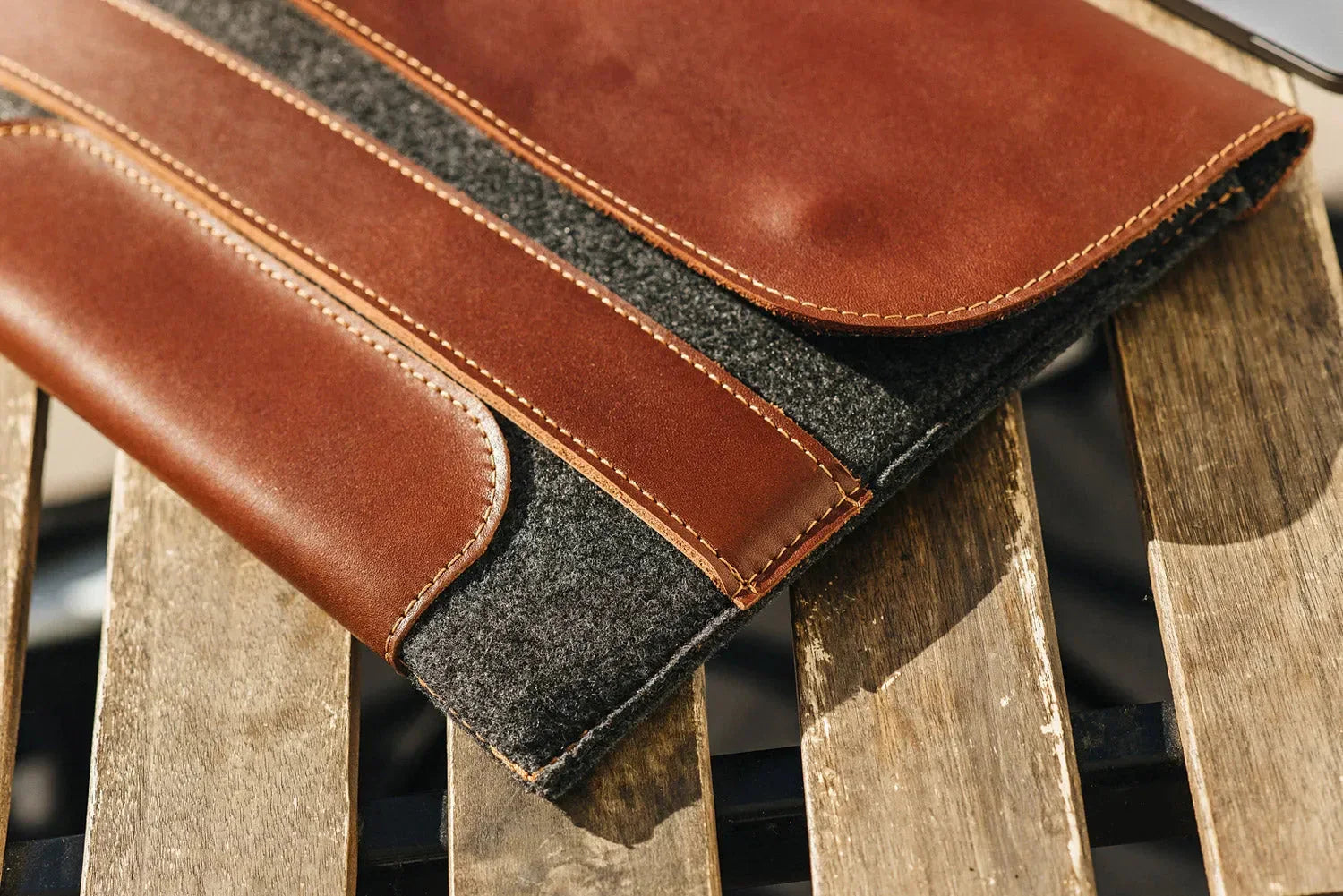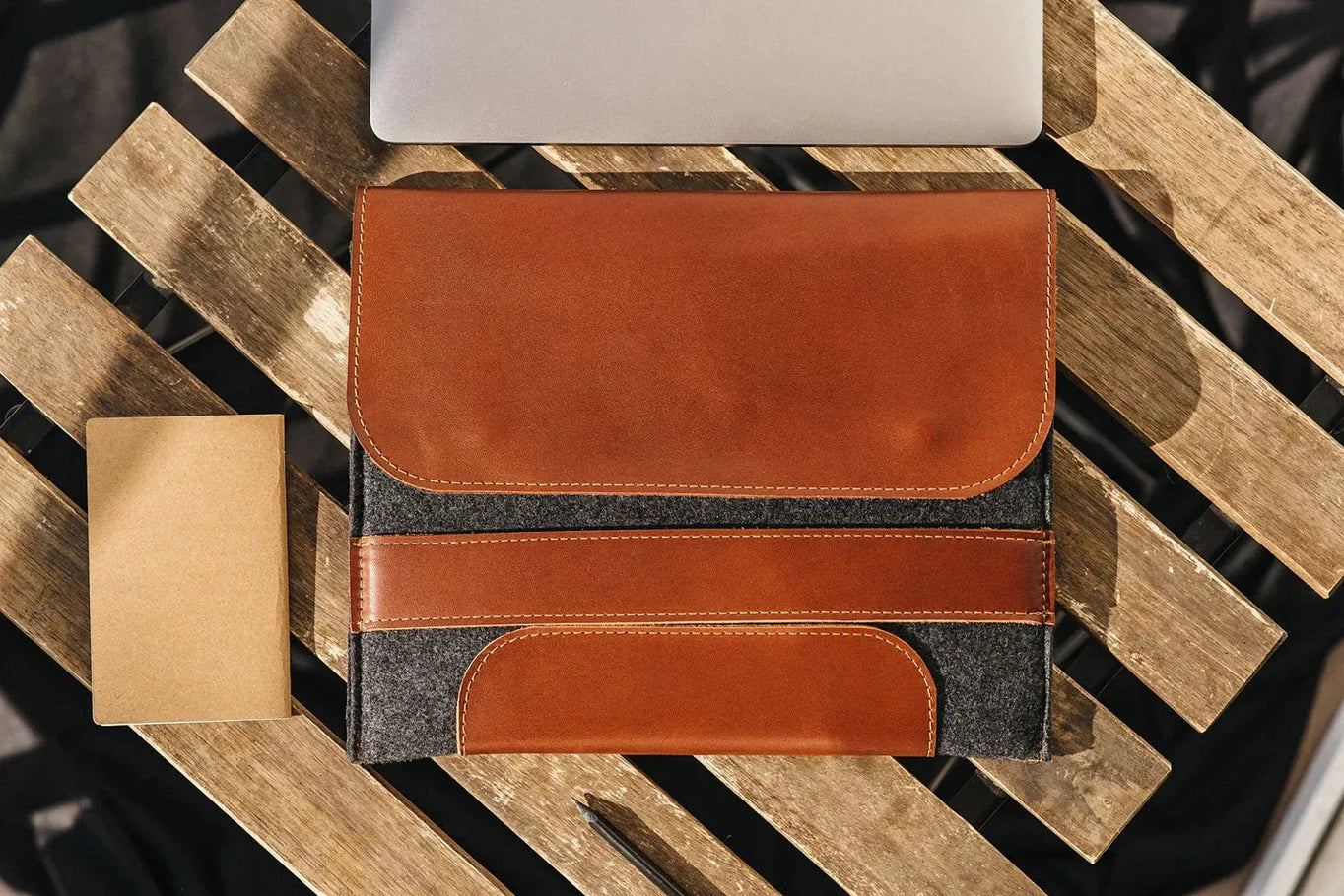 Цей шкіряний чохол із фетром поєднує захист, функціональність і можливість персоналізації. Підійде як для роботи, так і для подорожей.