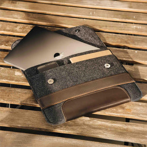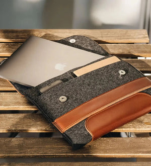 Надійно захистіть свій MacBook за допомогою чохла з натуральної шкіри та фетру, створеного для щоденного використання вдома, у дорозі чи в офісі. Завдяки магнітній застібці та зручній ручці для перенесення, він забезпечує комфорт і впевненість під час транспортування. Два відділення дозволяють зручно розмістити ноутбук, блокнот або телефон.