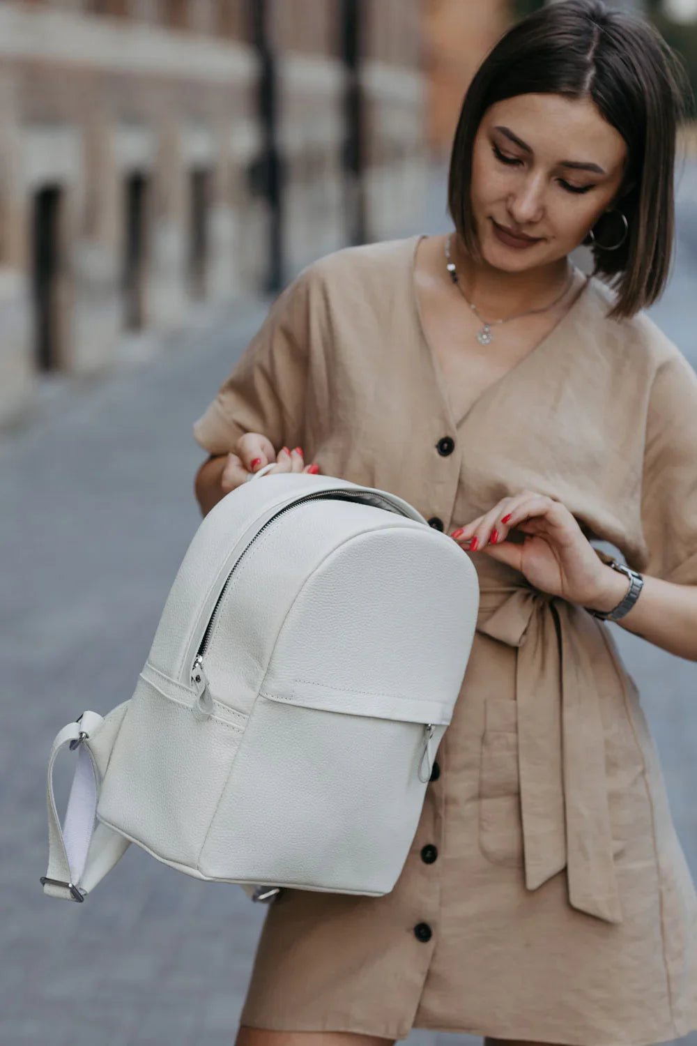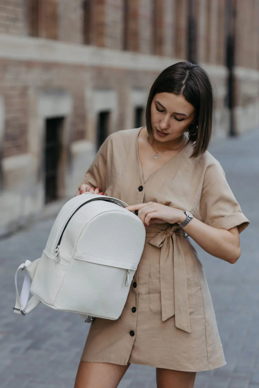 GraceBack – це свобода руху без втрати стилю. Каркасна форма тримає силует, завдяки чому рюкзак не зминається й не втрачає акуратного вигляду. Завдяки рівномірному розподілу ваги на обидва плечі GraceBack дарує відчуття свободи руху й легкості, яке неможливо отримати з сумкою на одному боці. Його зерниста шкіра з м’яким блиском додає текстури образу, не прив’язуючи до одного стилю – так само природно він виглядає поруч із піджаком і джинсами, поєднаними в кежуалі, як і з пальтом чи сукнею.