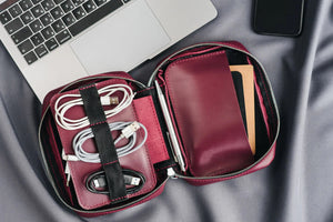 Шкіряний органайзер для техніки доступний у двох розмірах - М та L, чорному, коричневому, коньячному, синьому, червоному, бордовому кольорах.