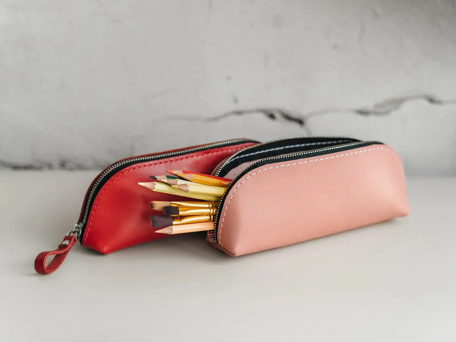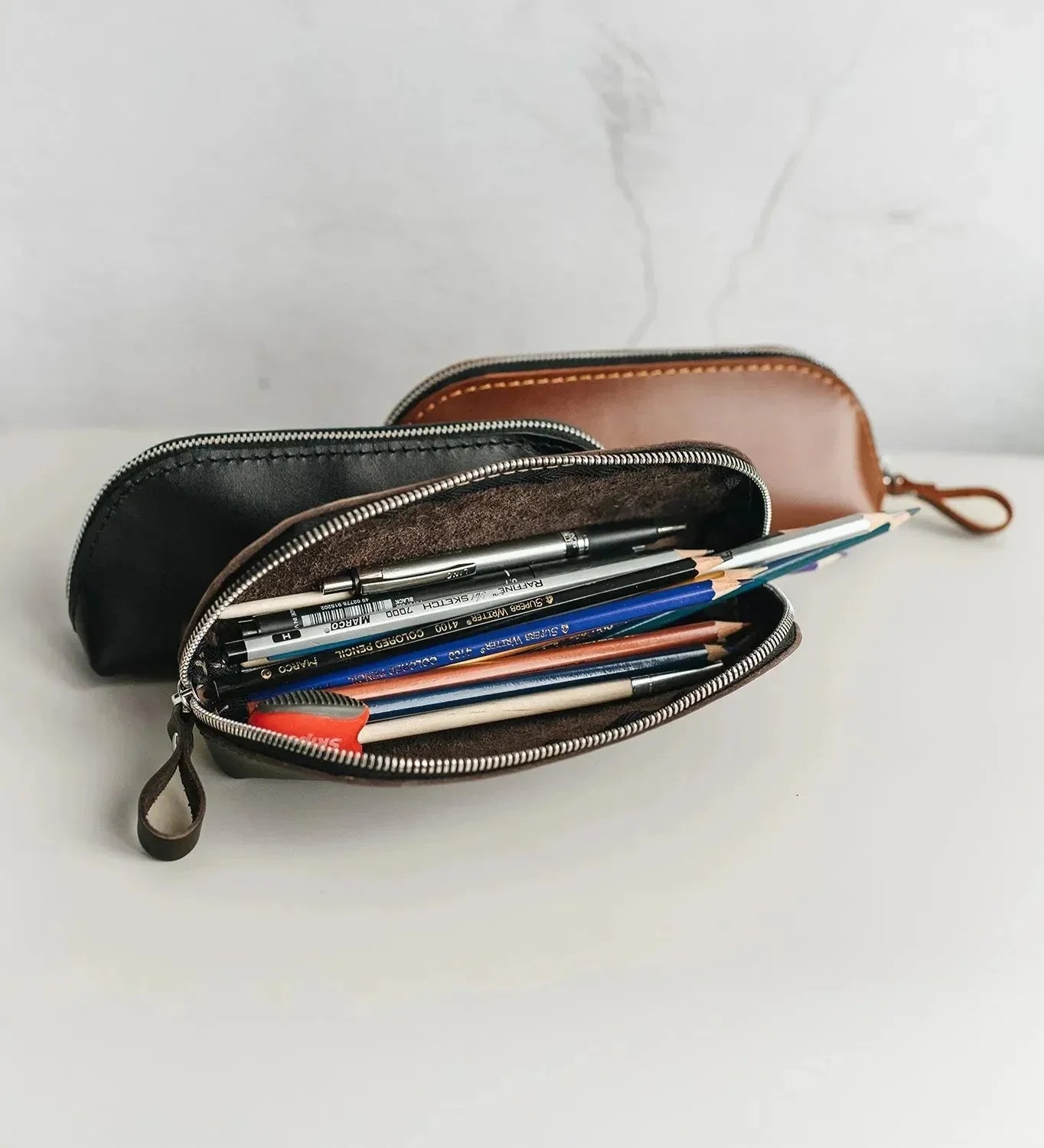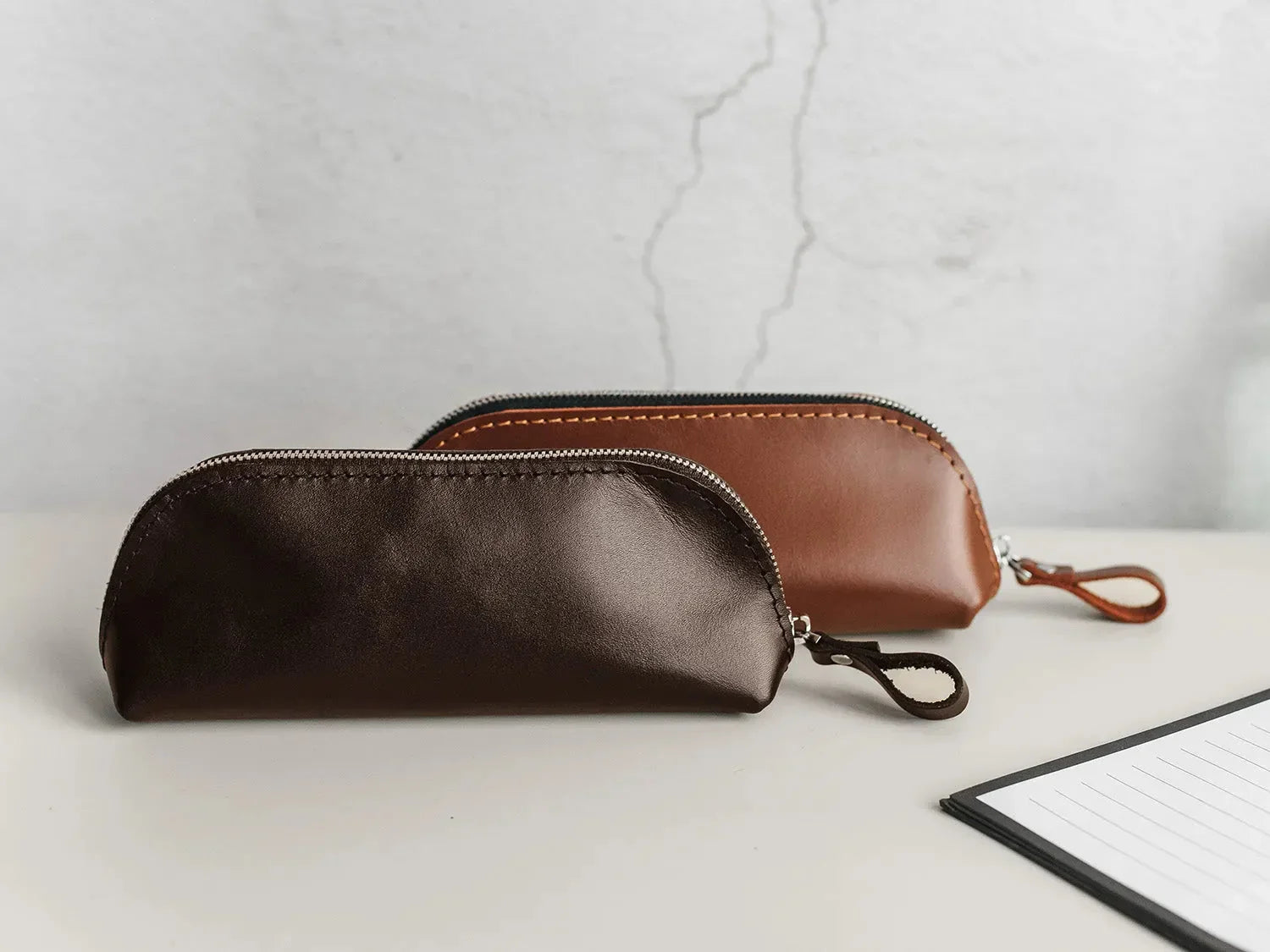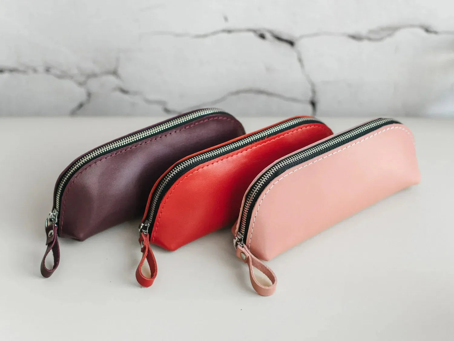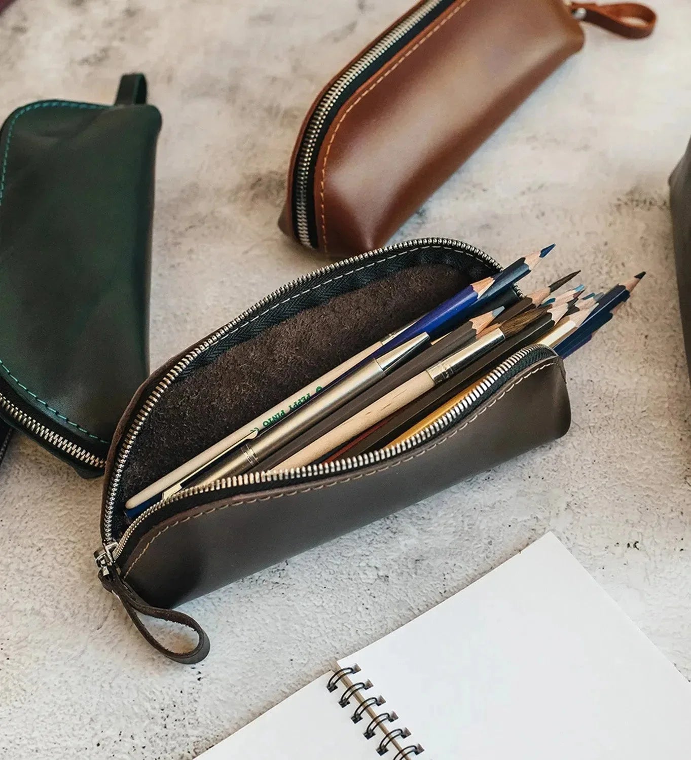 Шкіряний пенал на блискавці для зберігання олівців, пензликів чи дрібниць. Можна використати як невелику косметичку, щоб забезпечити порядок та організацію речей в одному місці.