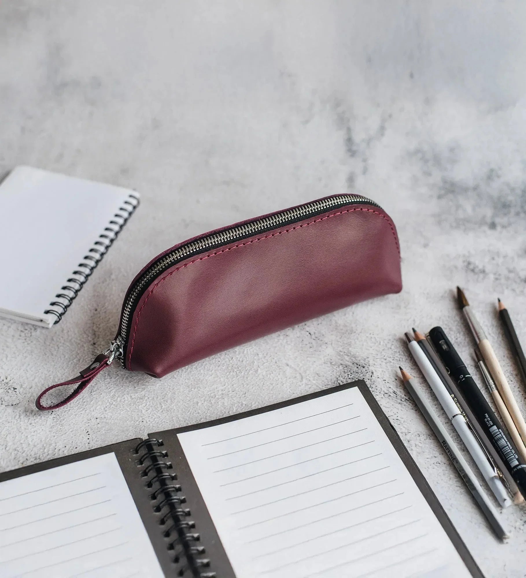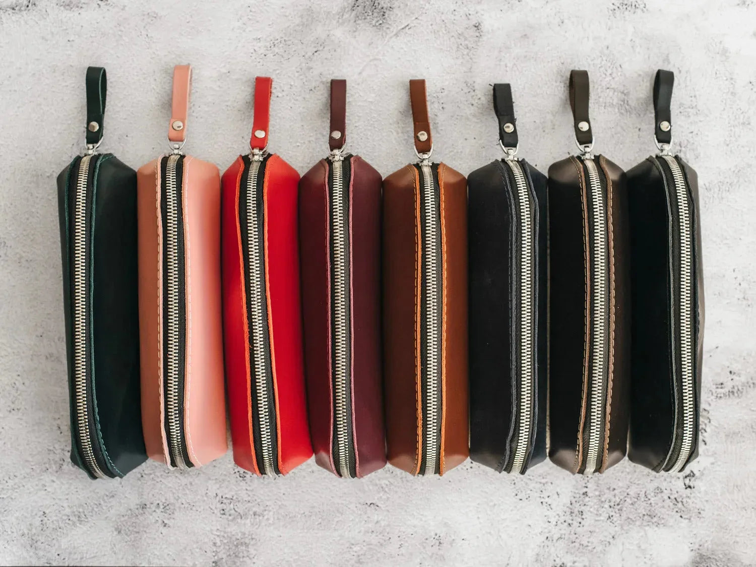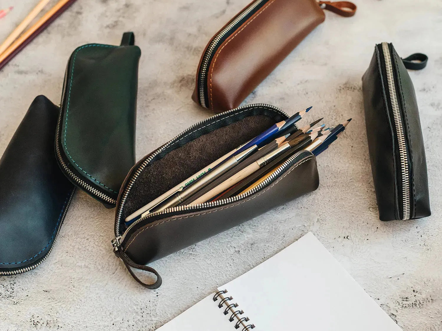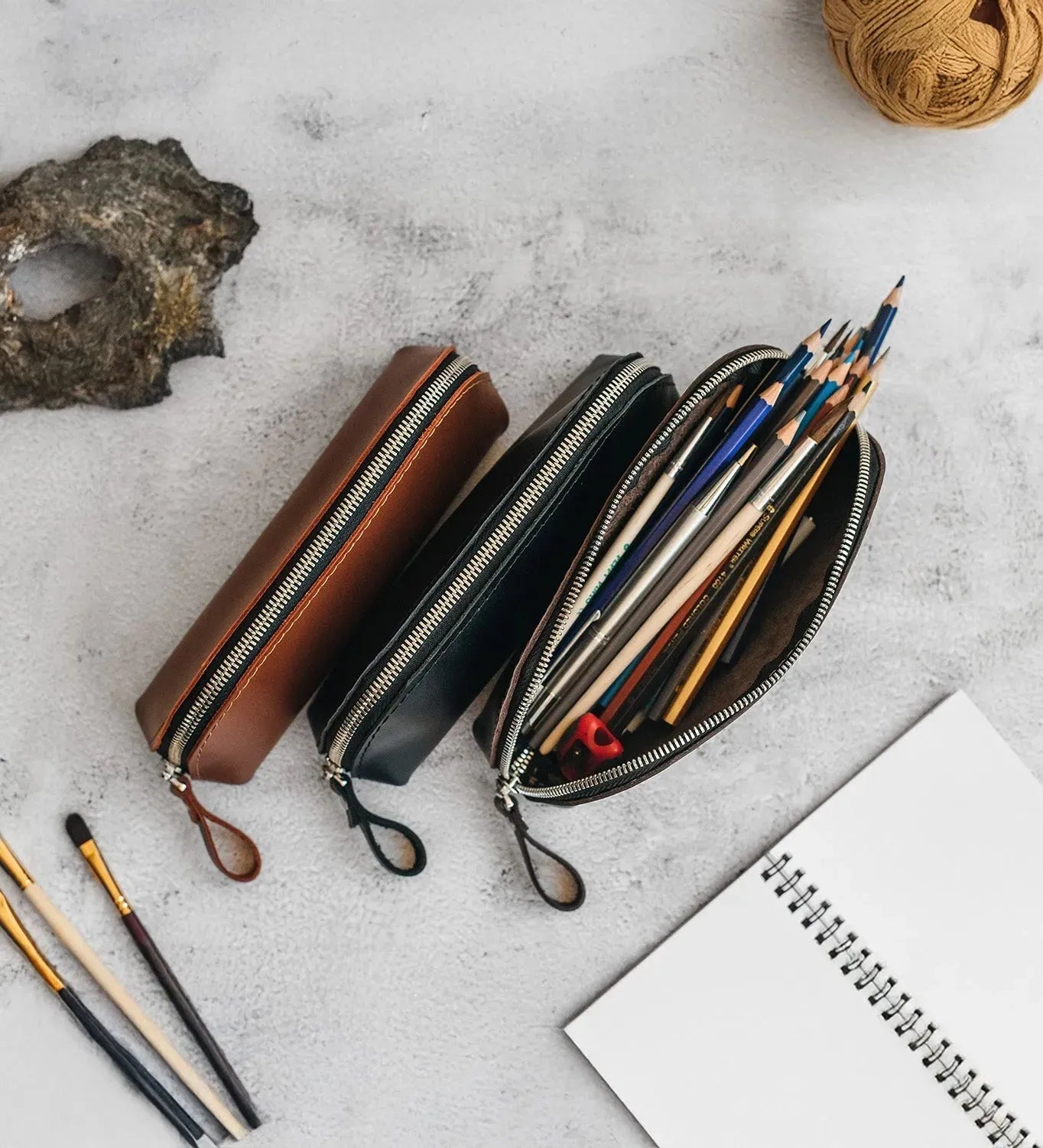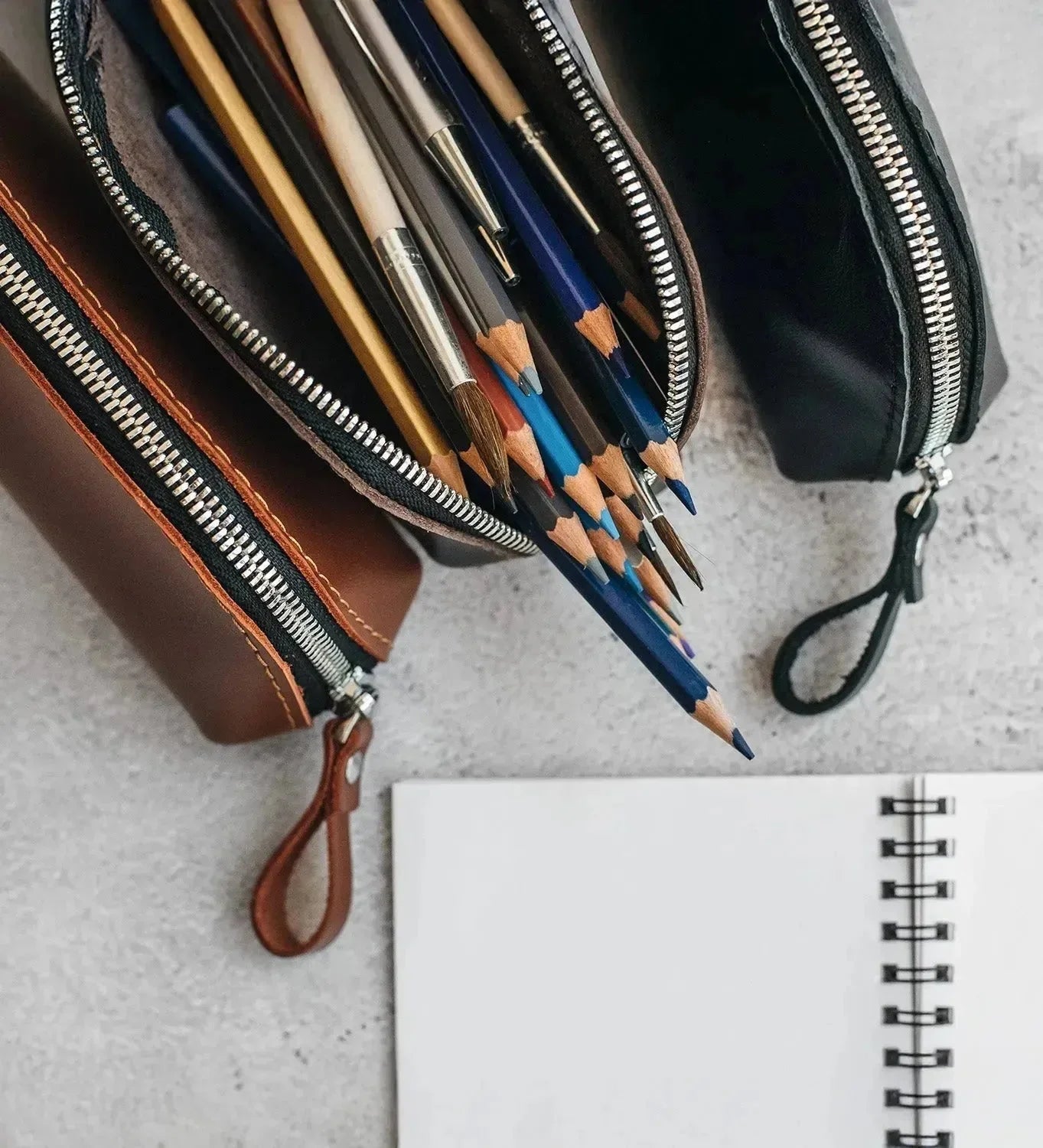 Шкіряний пенал на блискавці для зберігання олівців, пензликів чи дрібниць. Можна використати як невелику косметичку, щоб забезпечити порядок та організацію речей в одному місці.