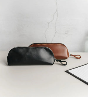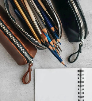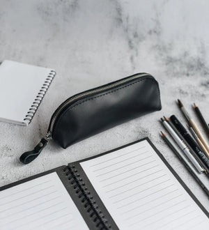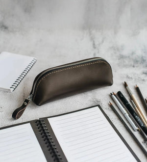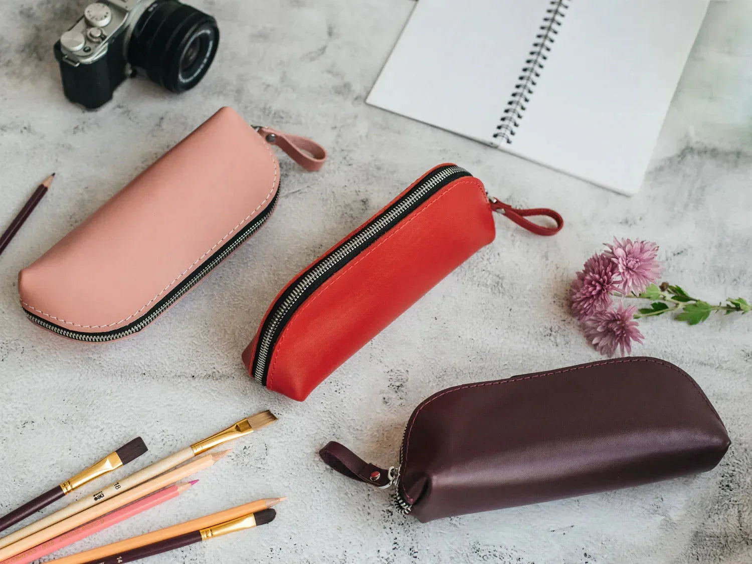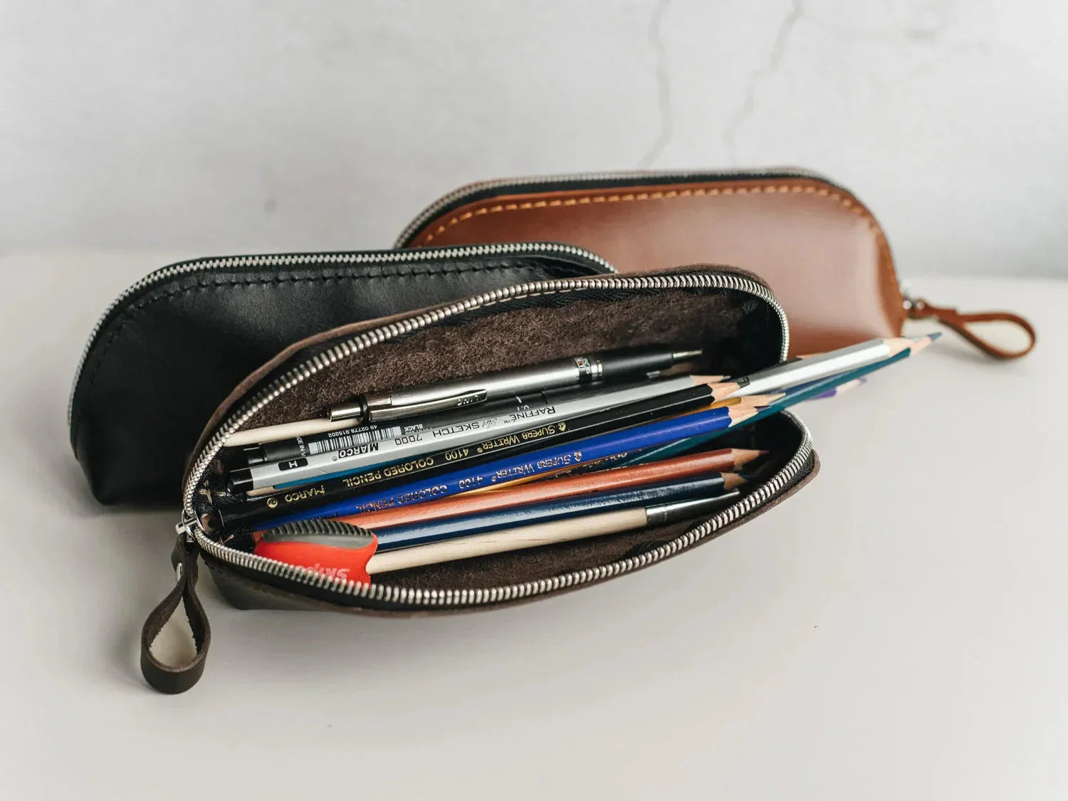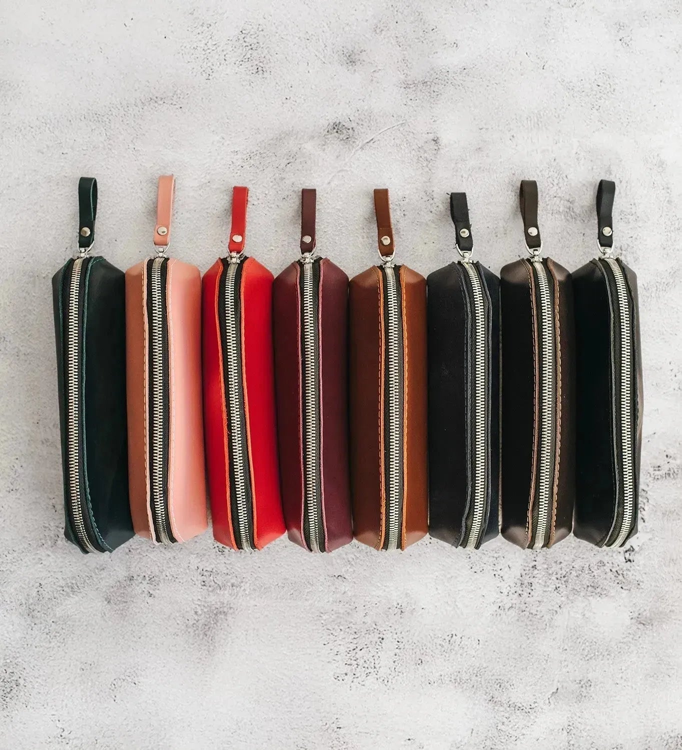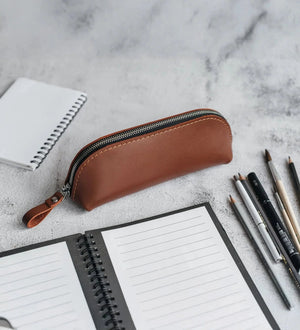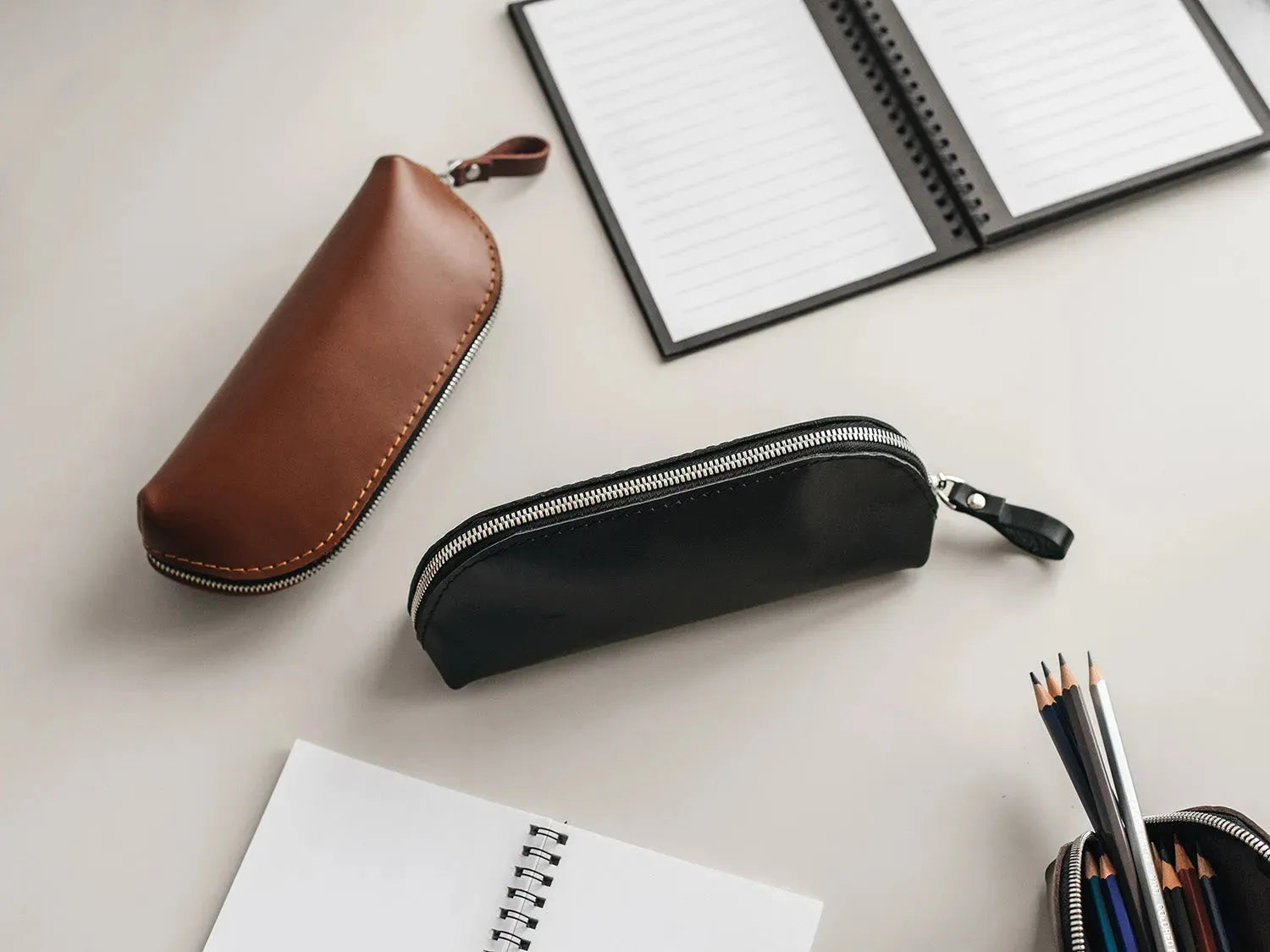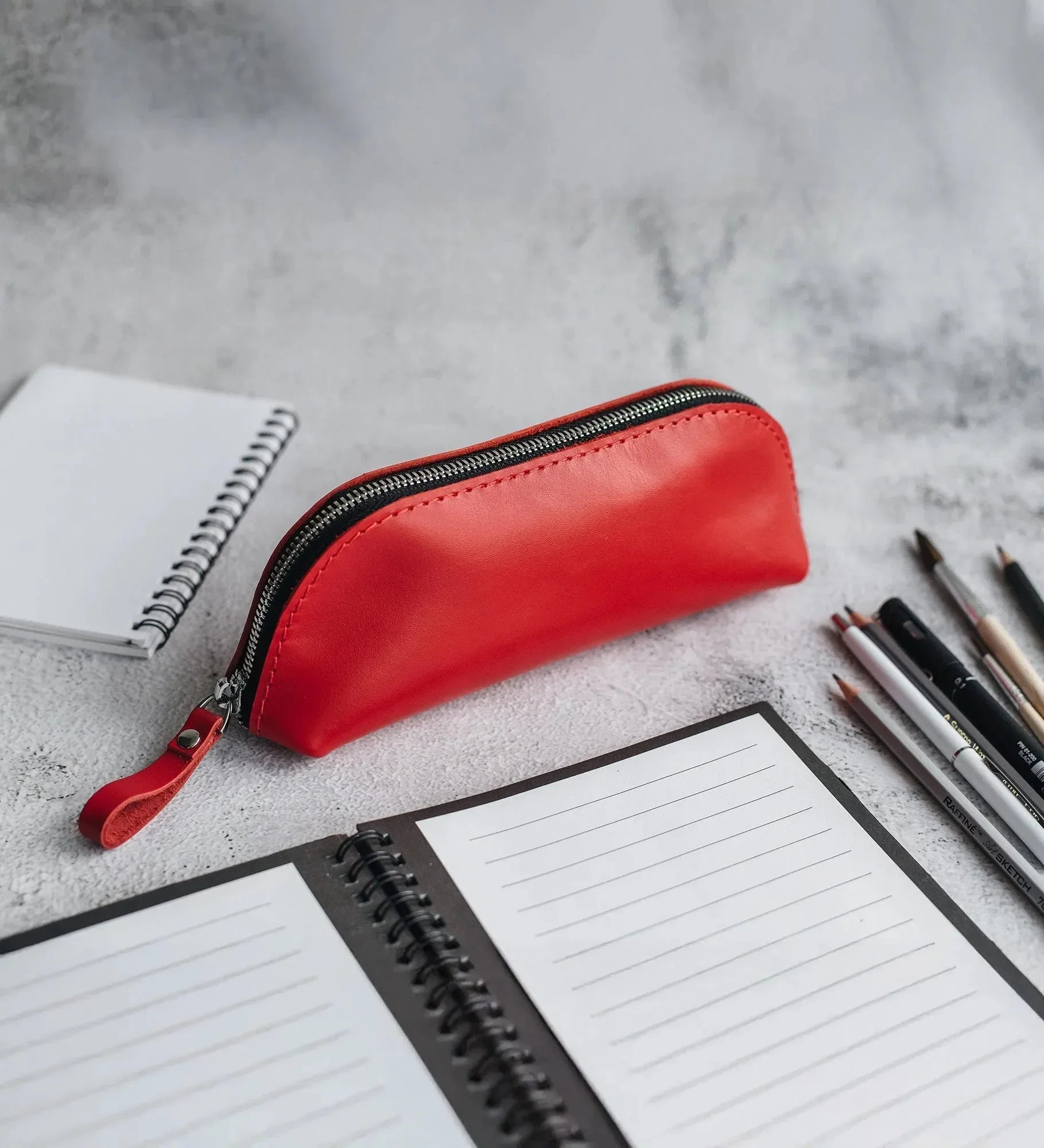Шкіряний пенал на блискавці для зберігання олівців, пензликів чи дрібниць. Можна використати як невелику косметичку, щоб забезпечити порядок та організацію речей в одному місці.